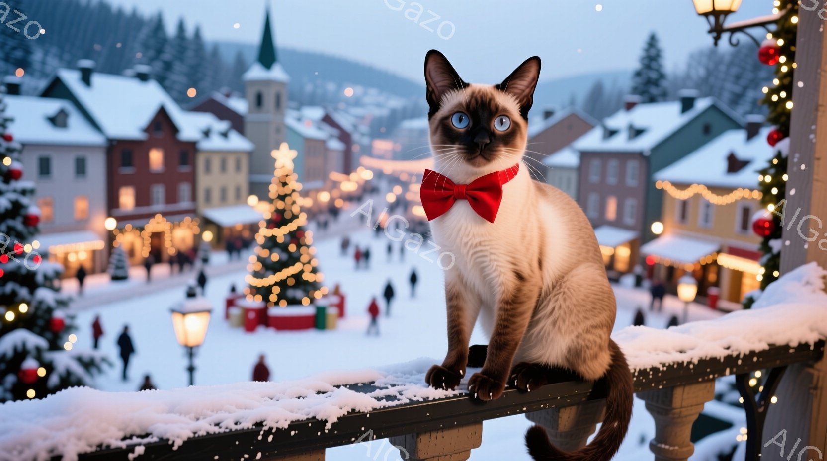 白い雪に覆われた街並みを背景に、タイ猫が手すりに座ってこちらを見ている。猫は赤い蝶ネクタイを付けており、その瞳は鮮やかなブルーで、どこか高貴な雰囲気を漂わせている。背景には、クリスマスツリーが飾られた賑やかな冬の街並みが広がり、暖かな光が雪景色を照らしている。
