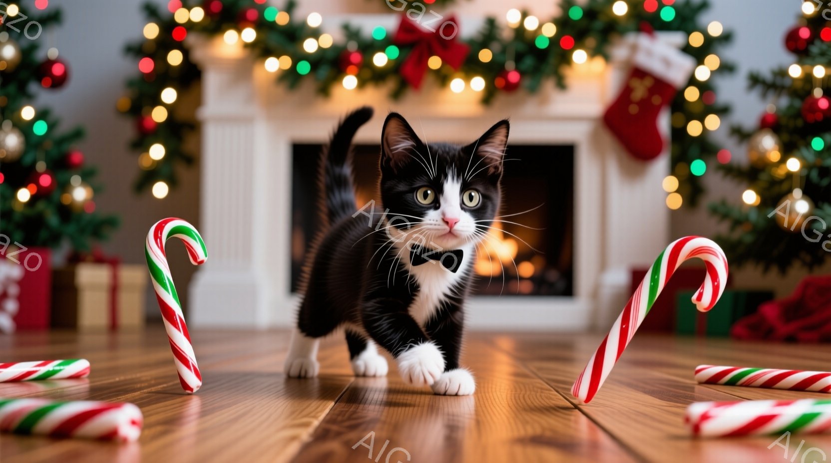 白と黒の毛並みを持つ子猫が、赤い蝶ネクタイをつけ、木の床の上を駆け抜けています。背景には、暖炉、クリスマスストッキング、プレゼント、そして光るクリスマスツリーがあり、クリスマスの装飾が施されています。全体的に暖かく、お祝いの雰囲気が漂い、可愛らしい子猫がクリスマスの喜びをさらに引き立てています。