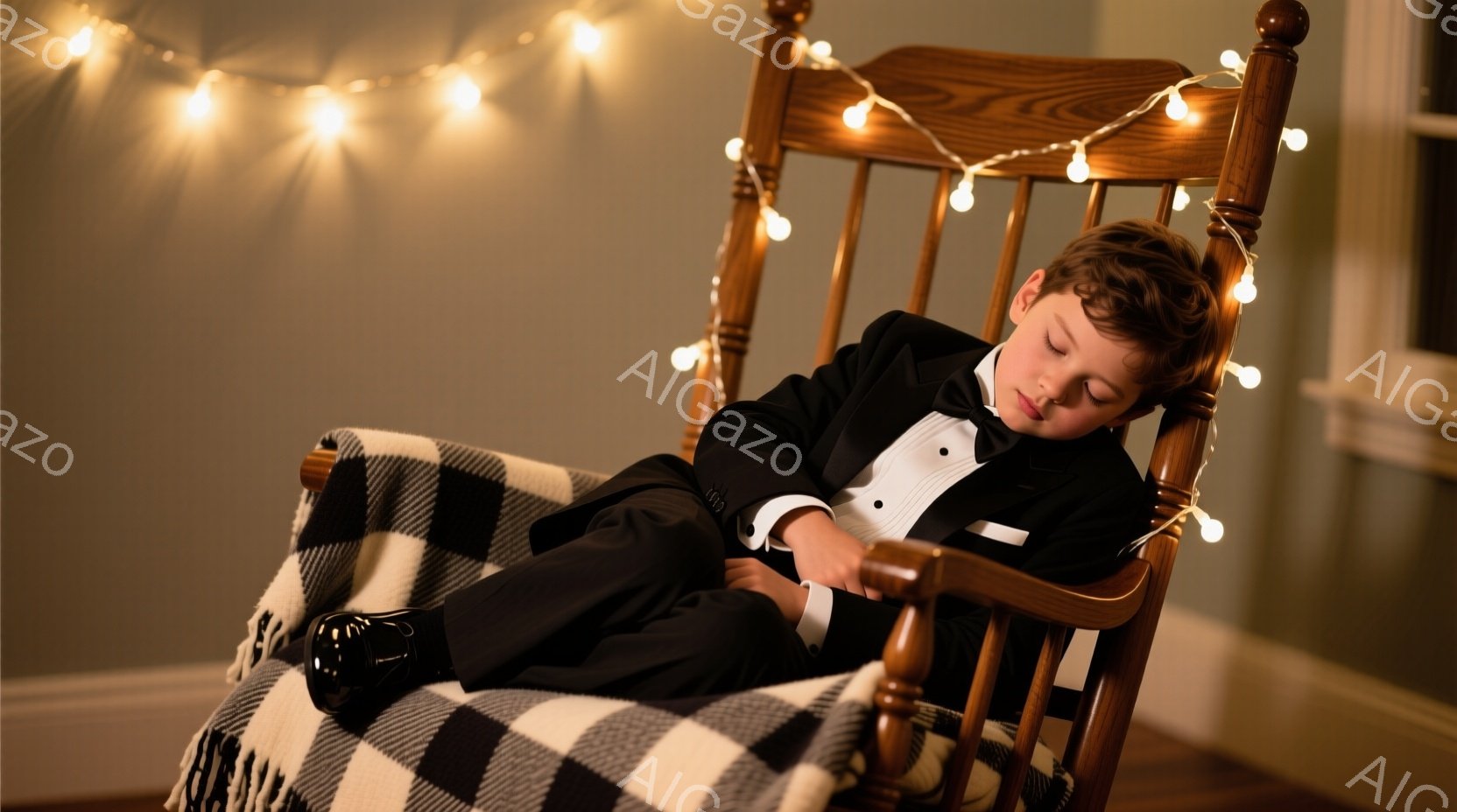 若い男性がロッキングチェアに横たわり、眠っている様子が写っている。彼は黒いタキシード、白いシャツ、蝶ネクタイを身に着けており、足元には黒い靴が履かれている。背景は暗い壁で、頭上には暖かい光を放つストリングライトが飾られ、全体的にリラックスした、夢のような雰囲気を醸し出している。