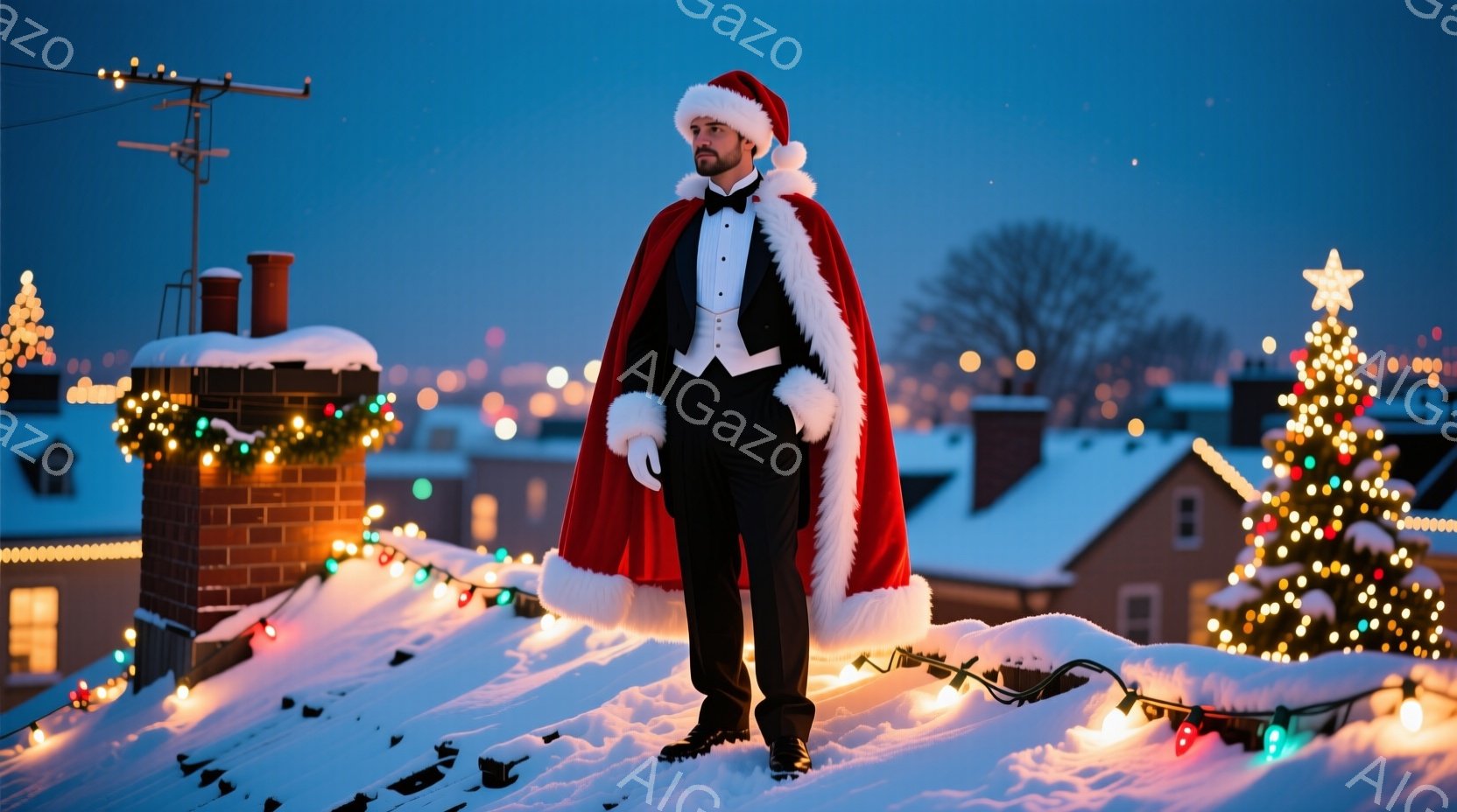 サンタクロースが雪の積もった屋根の上に立っており、赤いマントと黒いスーツ姿で、少し微笑んでいます。背景には、イルミネーションで飾られたレンガの煙突や、遠くに見える街並み、そして雪が降る夜空が広がっています。全体的に、クリスマスの温かく幻想的な雰囲気が漂っています。
