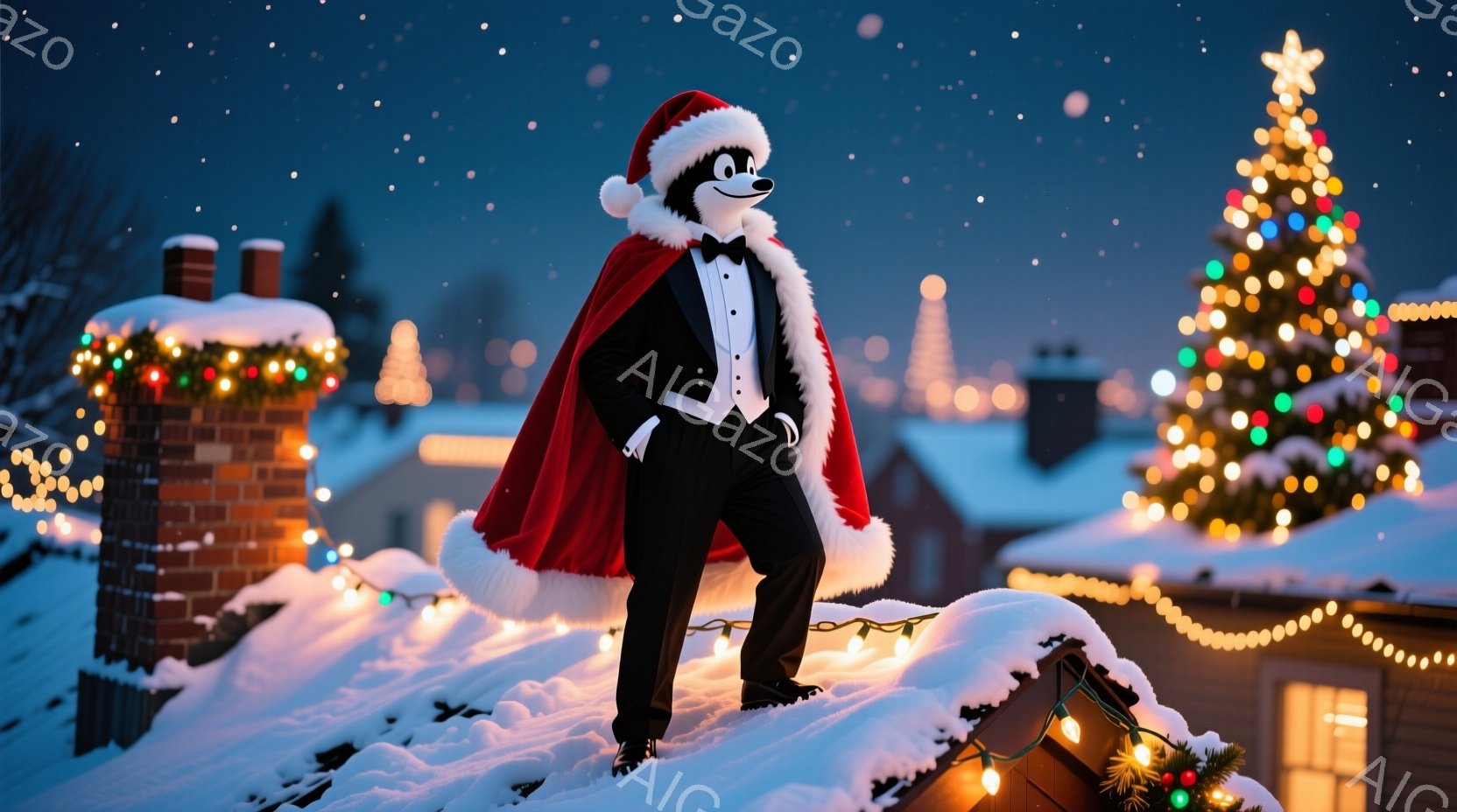 屋根の上には、サンタクロースの衣装を着た男性が立っている。彼は黒いズボンとベスト、白いシャツ、赤いマント、そしてサンタ帽を着用しており、少し顎ひげを生やしている。背景には雪に覆われた家々やクリスマスツリー、そして夜空が広がり、全体的に暖かく、少し物憂げなクリスマスの雰囲気が漂っている。