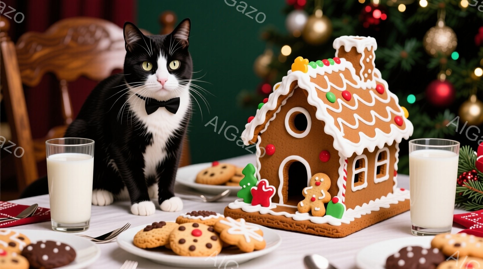 白と黒の猫が、クリスマスのジンジャーブレッドハウスとクッキーが置かれたテーブルの上に座っています。猫は蝶ネクタイを付けており、少し上目遣いでカメラを見つめています。背景には、装飾されたクリスマスツリーと赤いテーブルクロスが広がり、温かくお祝いムードの雰囲気が漂います。