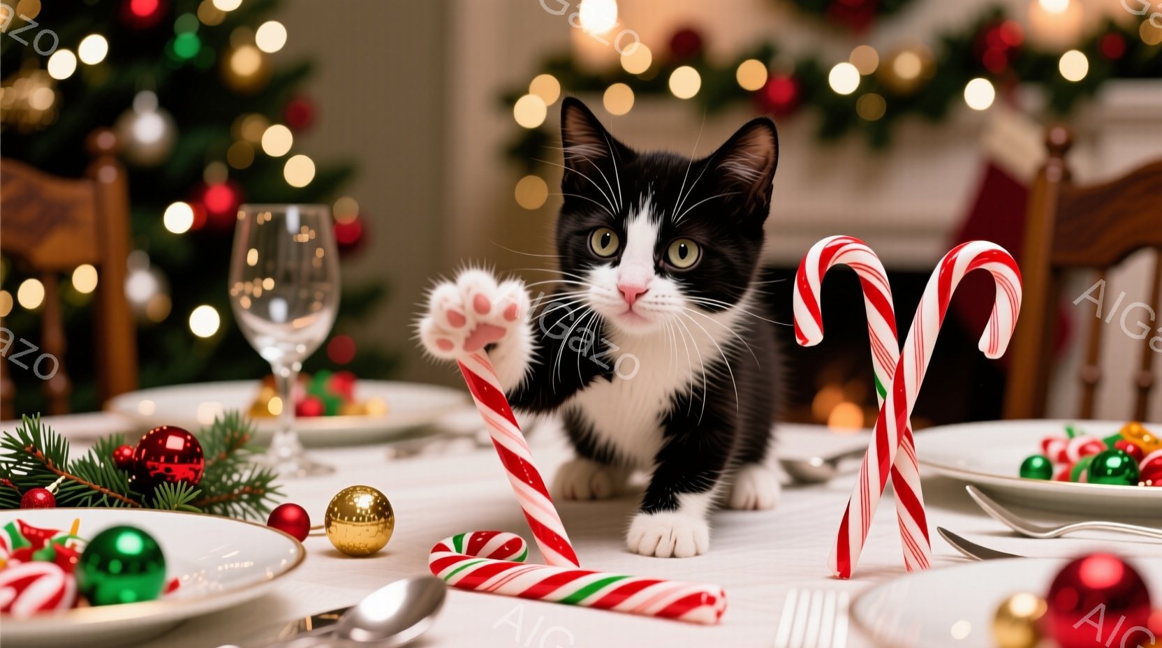 白黒の猫が、クリスマスを意識した食卓の上で、片方の前足でペパーミントキャンディを掴んでいます。背景にはぼやけたクリスマスツリーと装飾が映り、テーブルには食器や他のキャンディが置かれ、温かくお祝いムードが漂っています。猫は正面を見ており、好奇心と遊び心のある表情をしています。