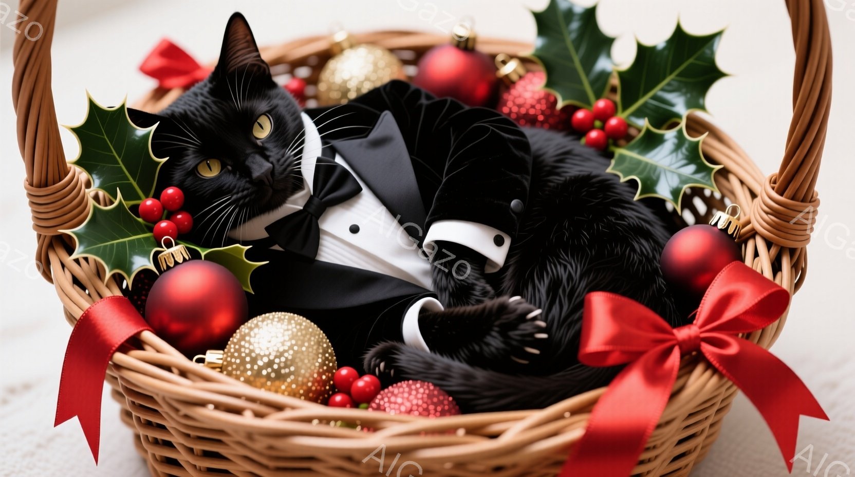 白と黒の猫が、クリスマスデコレーションの入った籐の籠の中に横たわっています。猫は黒いタキシードと蝶ネクタイを身に着け、リラックスした表情で、まるで特別な日のために着飾っているかのようです。背景には、赤い実の付いた緑の葉と金色のクリスマスオーナメントが散りばめられ、温かくお祝いムードに包まれています。