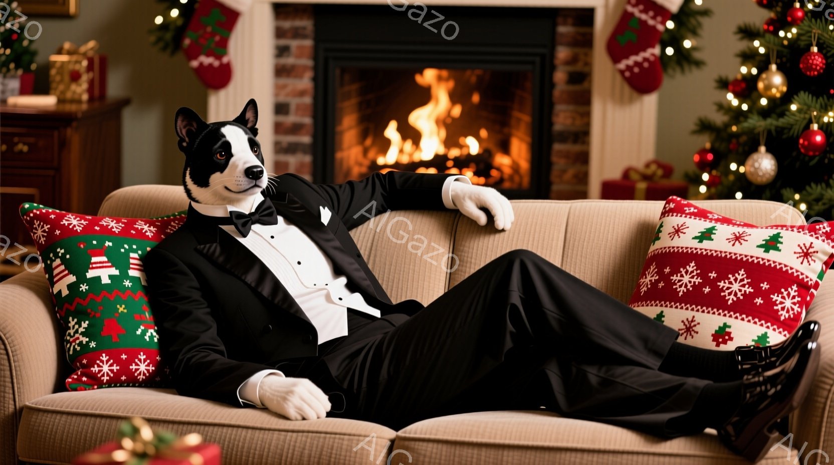 白黒の犬が、タキシードを着てソファでくつろいでいる様子が描かれています。彼は片足をもう一方の膝に乗せ、リラックスした姿勢で、どこか余裕のある表情をしています。背景にはクリスマスツリーと暖炉があり、温かく華やかなクリスマスの雰囲気を醸し出しています。