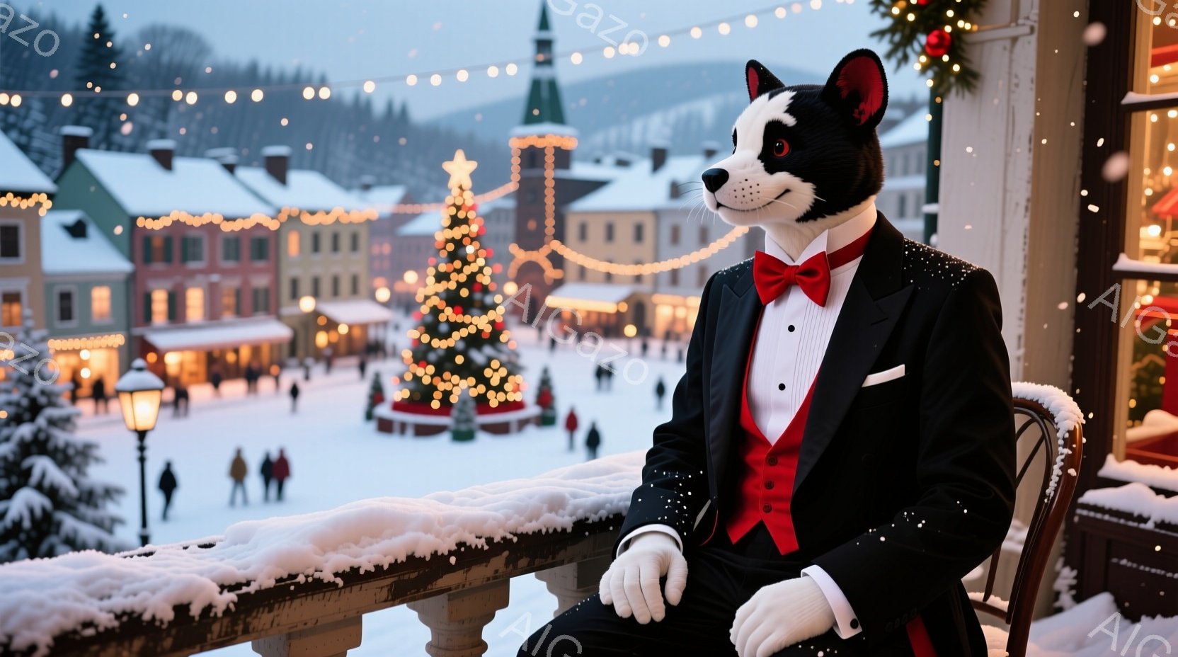 雪に覆われた街並みを背景に、黒いタキシードと赤いベスト、蝶ネクタイを身につけた動物のキャラクターが描かれている。キャラクターはバルコニーに座り、片手を重ねて落ち着いた様子で、雪が舞う冬の穏やかな雰囲気を醸し出している。背景には、クリスマスツリーや装飾が施された建物が並び、冬の祭りのような華やかさが感じられる。