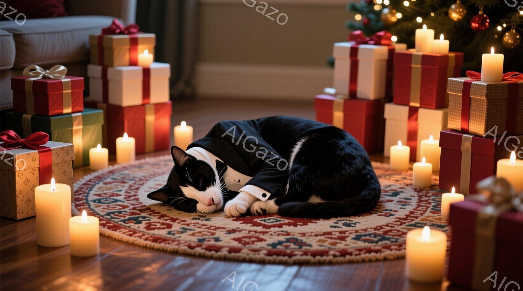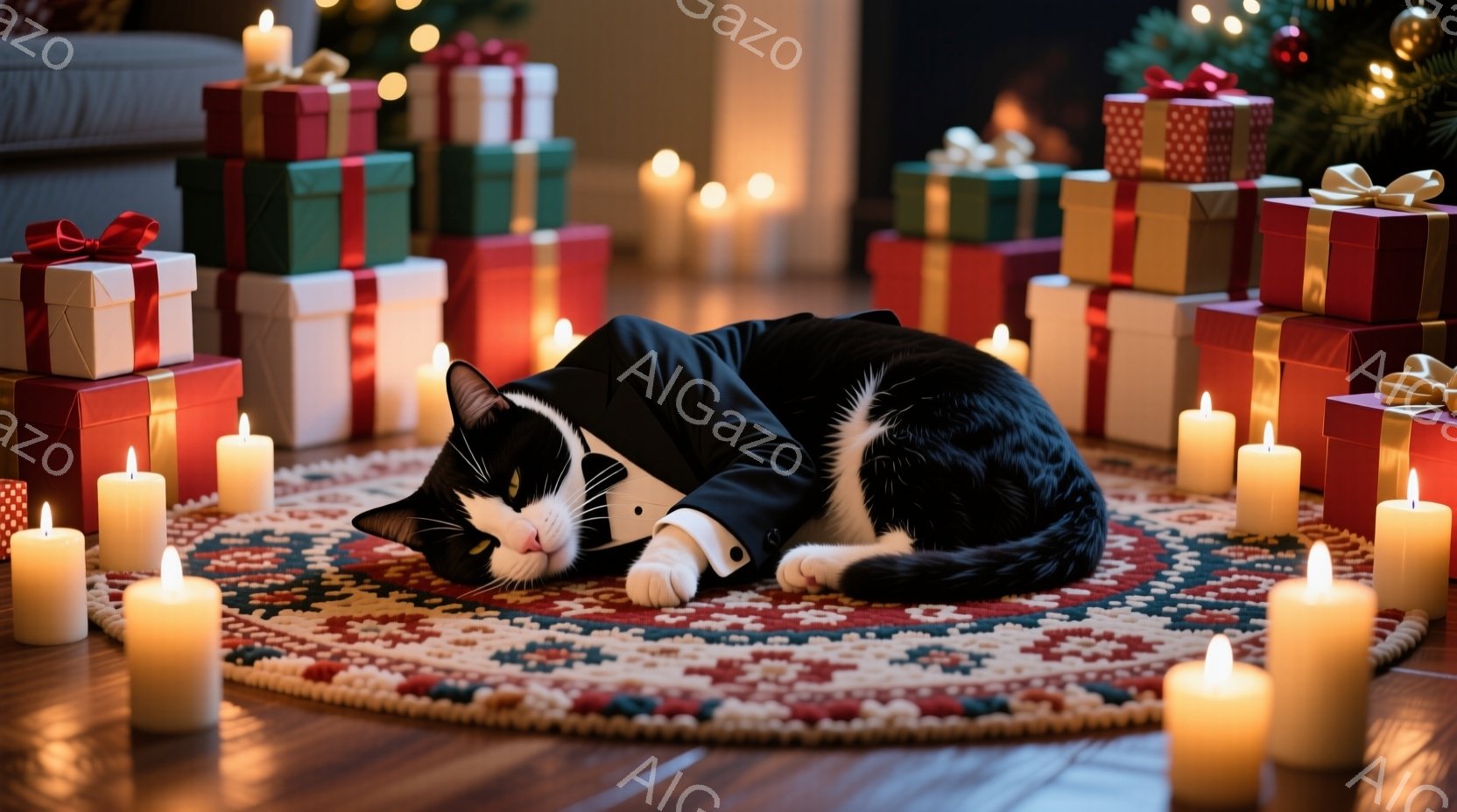 白と黒の猫が、赤い模様のある絨毯の上で仰向けに寝ています。黒いジャケットと蝶ネクタイを身に着け、まるで優雅な紳士のようにリラックスした様子です。背景には、クリスマスのプレゼントの箱や点灯されたキャンドルが並び、温かく幻想的な雰囲気を醸し出しています。