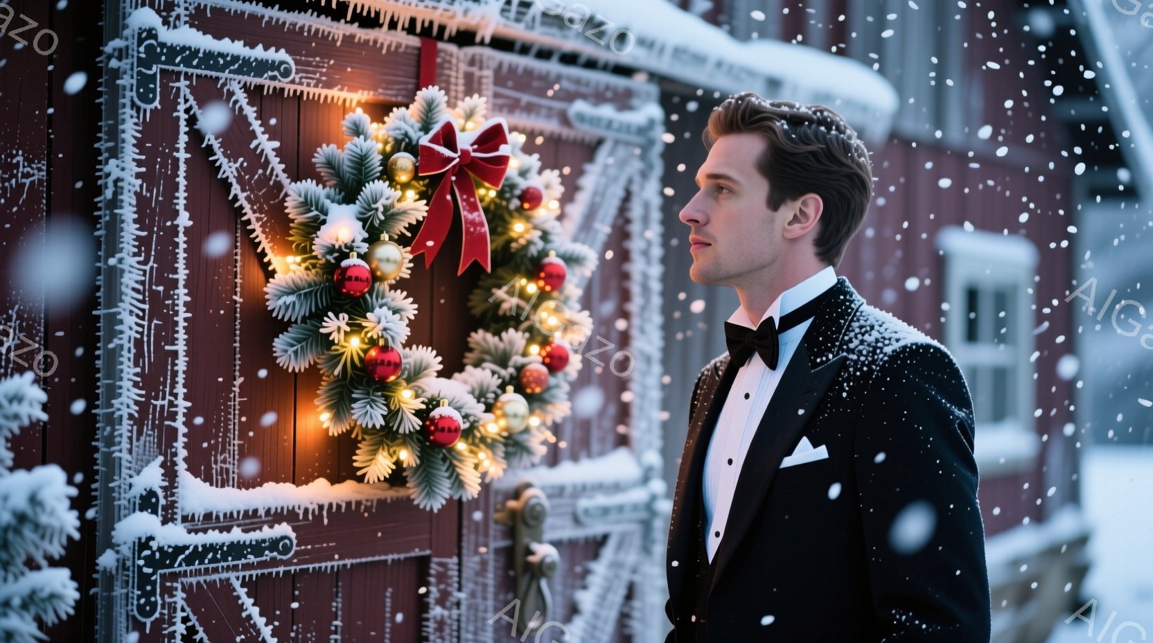 男性がタキシードを身につけ、正装で雪の中で花祭りのウィンドウに注意を向ける。彼は感動的な表情を見せています。