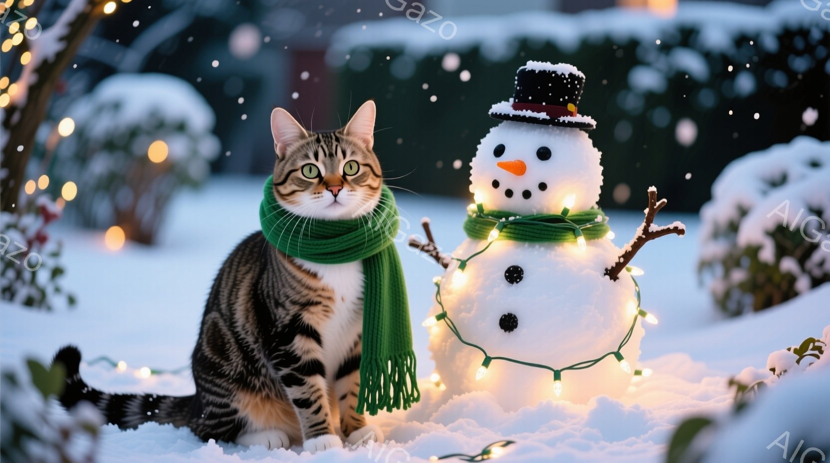 白い雪の上に、緑のスカーフを巻いた縞模様の猫が座っています。猫は前足を揃えて座り、少し上目遣いでこちらを見ています。背景には、電飾で飾られた雪だるまがあり、雪が舞う冬の穏やかな雰囲気が漂っています。