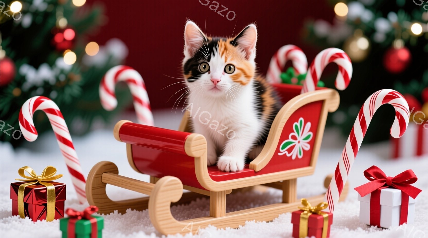 この無料AI生成画像「白い縞模様の猫がサンタクロースの帽子と赤いマントを身に着けて、雪の積もった屋根の上に座っています。その表情は落ち着いていて、まるでクリスマスを楽しんでいるかのようです。背景には点灯したクリスマスライト、煙突、そして遠くに見える家々があり、冬の暖かく幻想的な雰囲気を醸し出しています。」は、2025年10月25日に作成されました。 サイズは 1664×928px の高解像度で、商用利用も可能なフリー素材として提供しています。