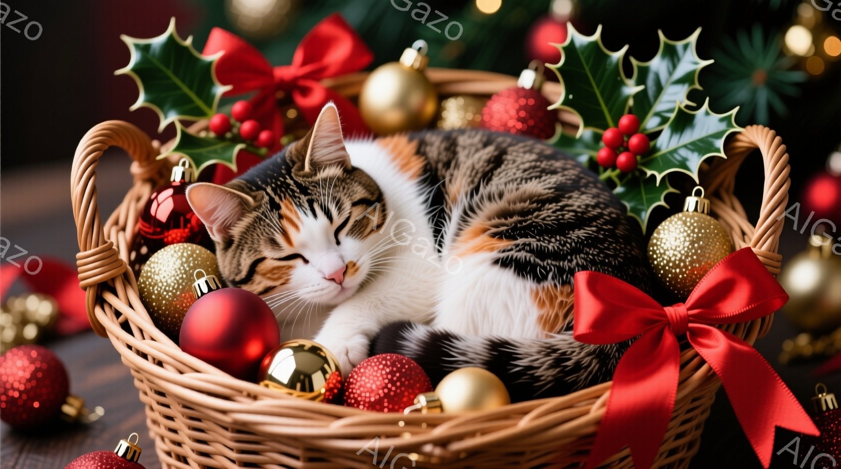 籠の中に白い胸元と縞模様の猫が丸まって眠っています。籠の中には赤いリボンと様々な色のクリスマスオーナメントが散りばめられており、背景は緑色の布とぼやけたクリスマスツリーの光で彩られています。全体的に暖かく、お祝いの雰囲気で、猫の安らかな眠りとクリスマスの装飾が組み合わさった、心安らぐ光景です。
