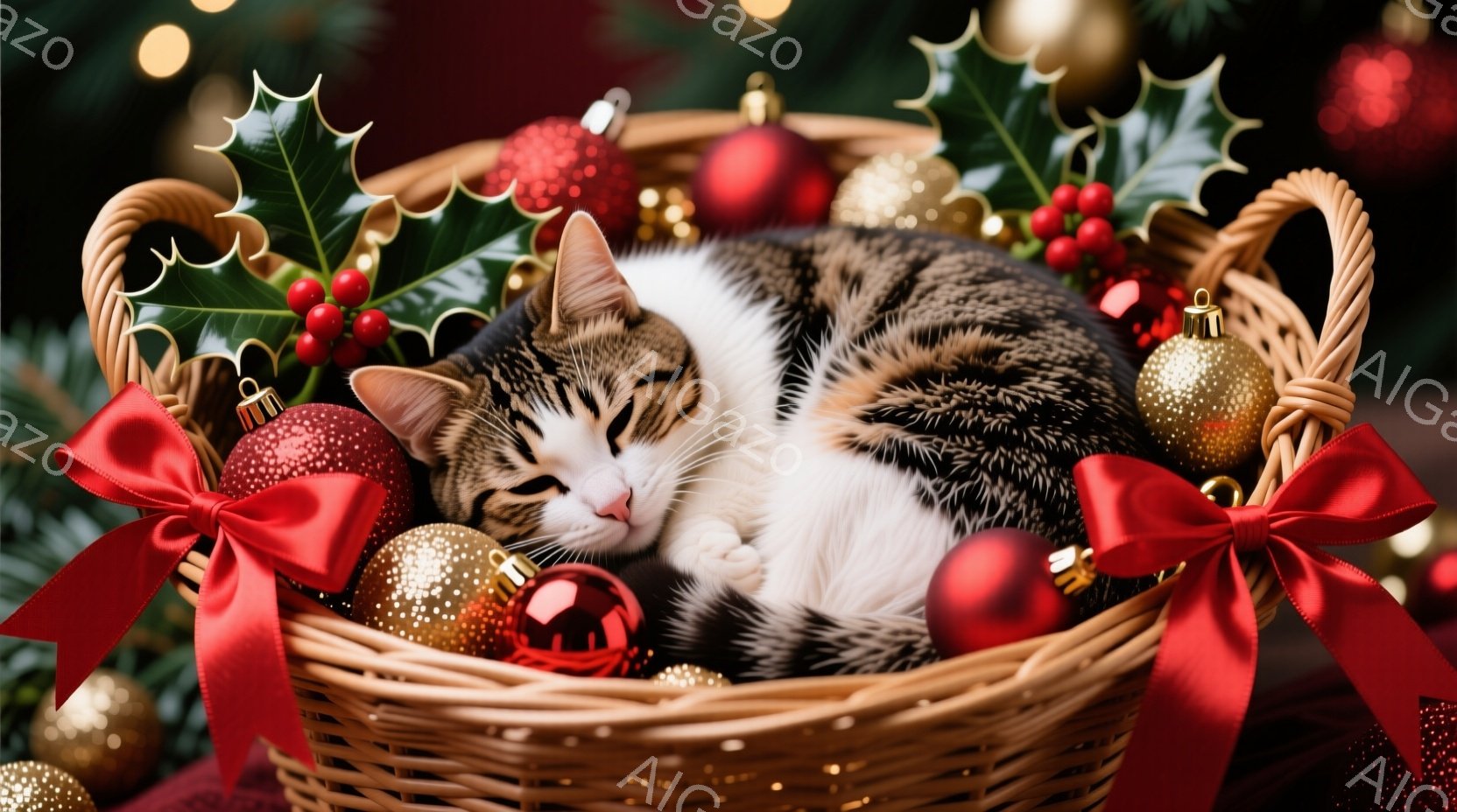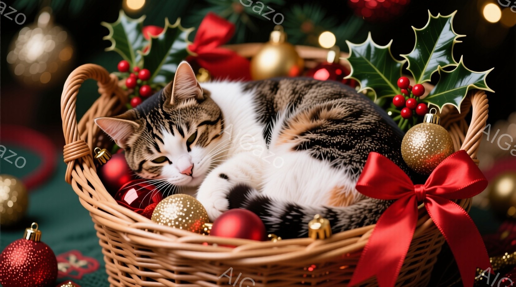 籠の中に、白と茶色の毛並みを持つ猫が丸まって眠っています。籠の周りには、赤いリボンと輝く装飾品が散りばめられ、背景にはぼやけたクリスマスツリーの光が灯っています。温かく、穏やかで、クリスマスの雰囲気を醸し出す、可愛らしい光景です。