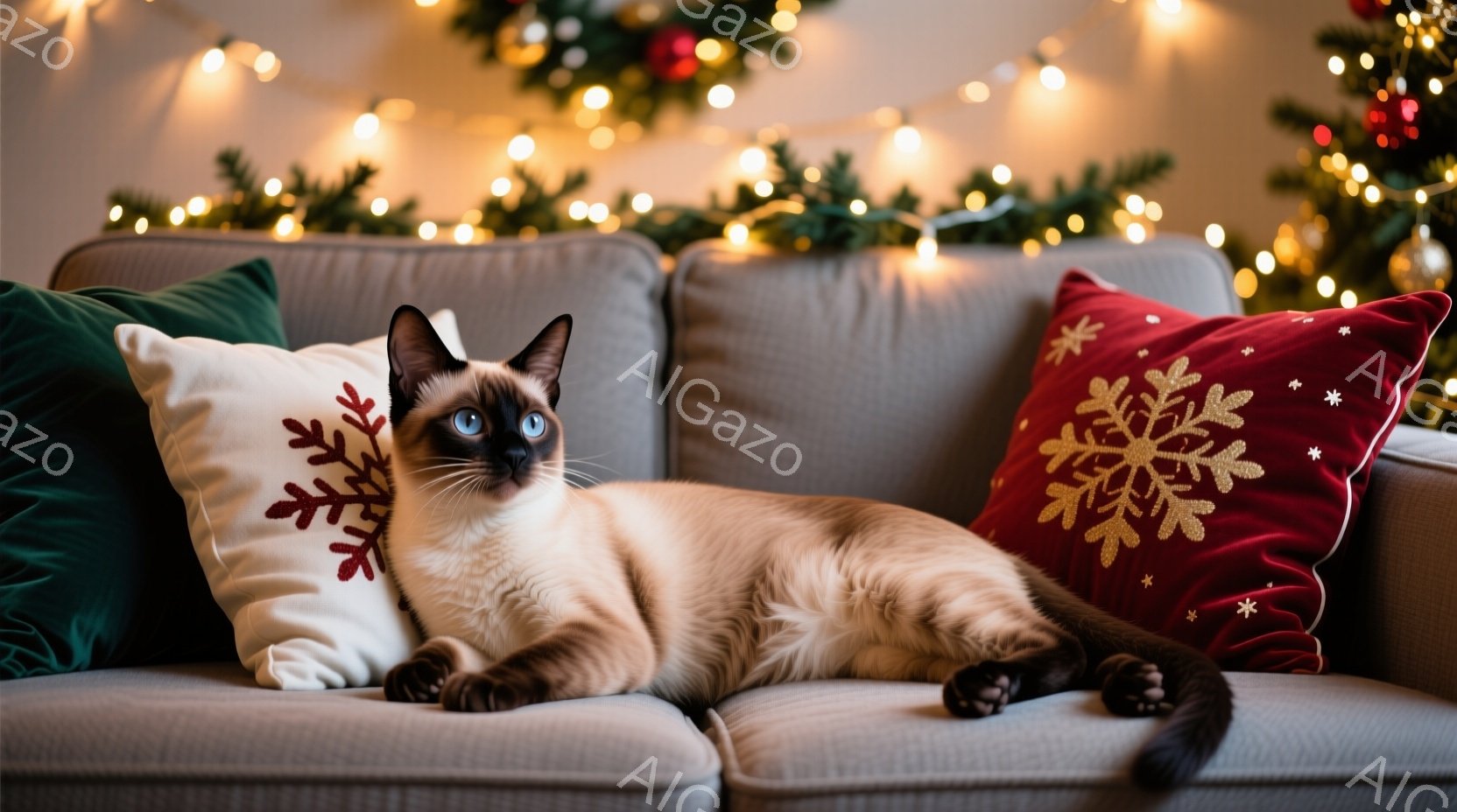 シベリアンハスキーのような毛色をした猫が、クリスマスの装飾が施されたソファーにゆったりと横たわっている。背景には、緑のガーランドと点滅するカラフルなクリスマスライトが見え、暖かくお祝いの雰囲気を作り出している。猫はリラックスした表情で、まるでホリデーシーズンを楽しんでいるかのようだ。