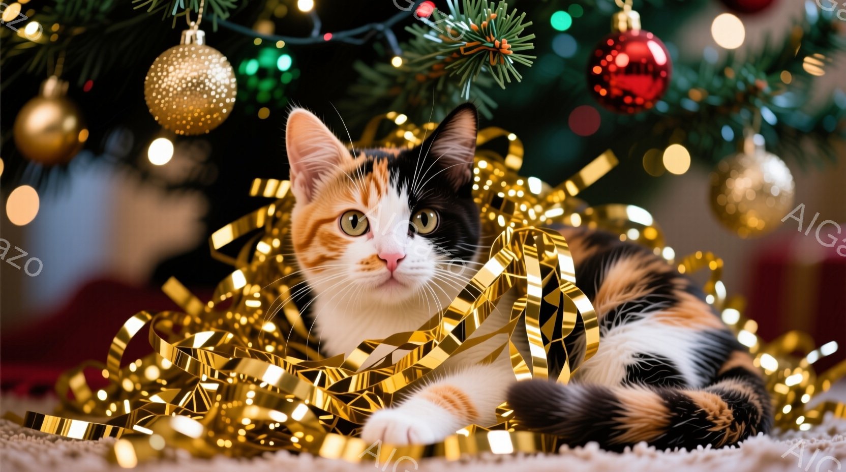 白、黒、オレンジのまだら模様の猫が、きらめく金色のガーランドに埋もれて横たわっています。猫は前足を伸ばし、少し上目遣いでカメラを見つめており、穏やかでリラックスした表情をしています。背景にはクリスマスツリーの飾りと光があり、全体的に暖かく、お祝いムードに満ちた雰囲気です。