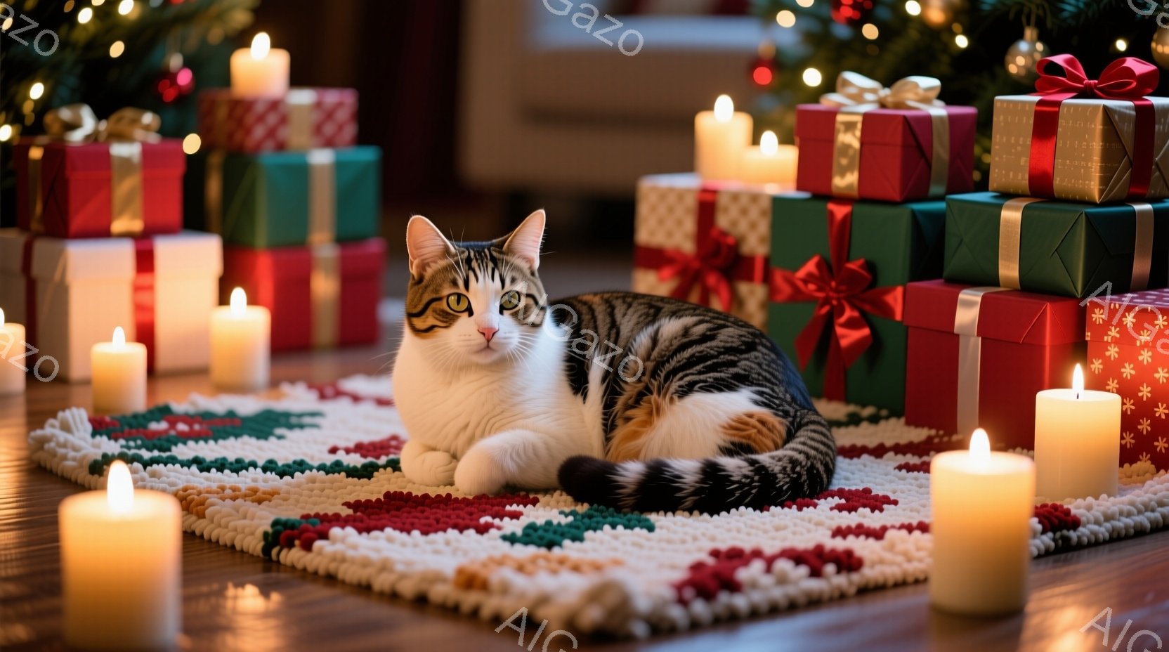 白と茶色の縞模様の猫が、赤い模様の敷物の上で横たわっています。猫の周りには、様々な色のラッピングペーパーで包まれたプレゼントの山と、点灯したキャンドルが置かれ、暖かくお祝いの雰囲気を醸し出しています。背景にはぼやけたクリスマスツリーが見え、全体的に心安らぐホリデーシーズンを感じさせる画像です。
