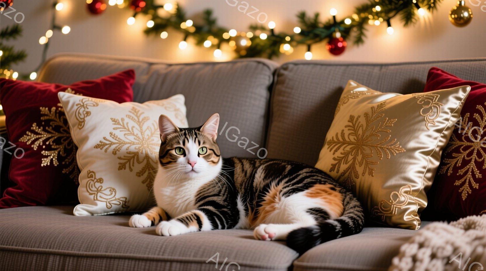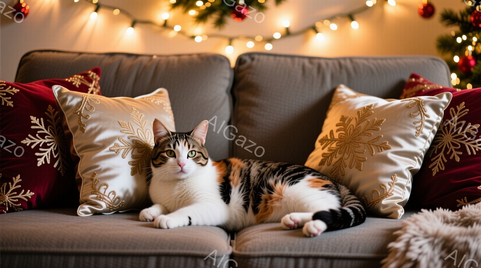 白と茶色のまだら模様の猫が、灰色のソファに横たわっています。背後には赤い枕と白い雪の結晶模様の枕が置かれ、ぼやけたクリスマスツリーと電飾が暖かく心地よい雰囲気を醸し出しています。猫はリラックスした様子でカメラの方を見ており、穏やかで冬らしい光景です。