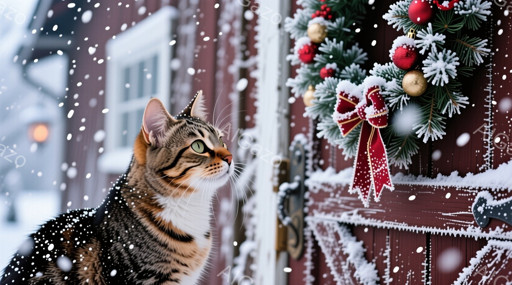 縞模様の猫が赤い木製の壁にかかったクリスマスリースを見上げています。雪が降り積もり、猫の毛並みや壁に白い覆いができており、冬の穏やかな雰囲気を醸し出しています。背景はぼやけていますが、雪景色の中に暖かい光が差し込み、季節の安らぎを感じさせます。