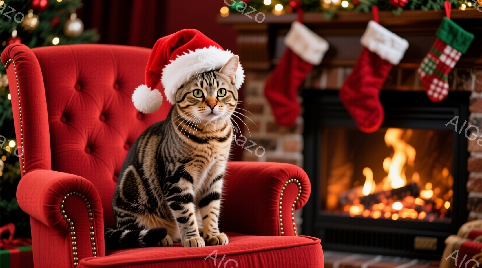 茶色の縞模様の猫が、赤いベルベットの肘掛け椅子に座り、サンタ帽をかぶっています。猫は正面を見て、少し微笑んでいるような表情をしています。背景には、暖炉の炎、クリスマスストッキング、そしてぼんやりとしたクリスマスツリーの光があり、暖かい冬の雰囲気です。