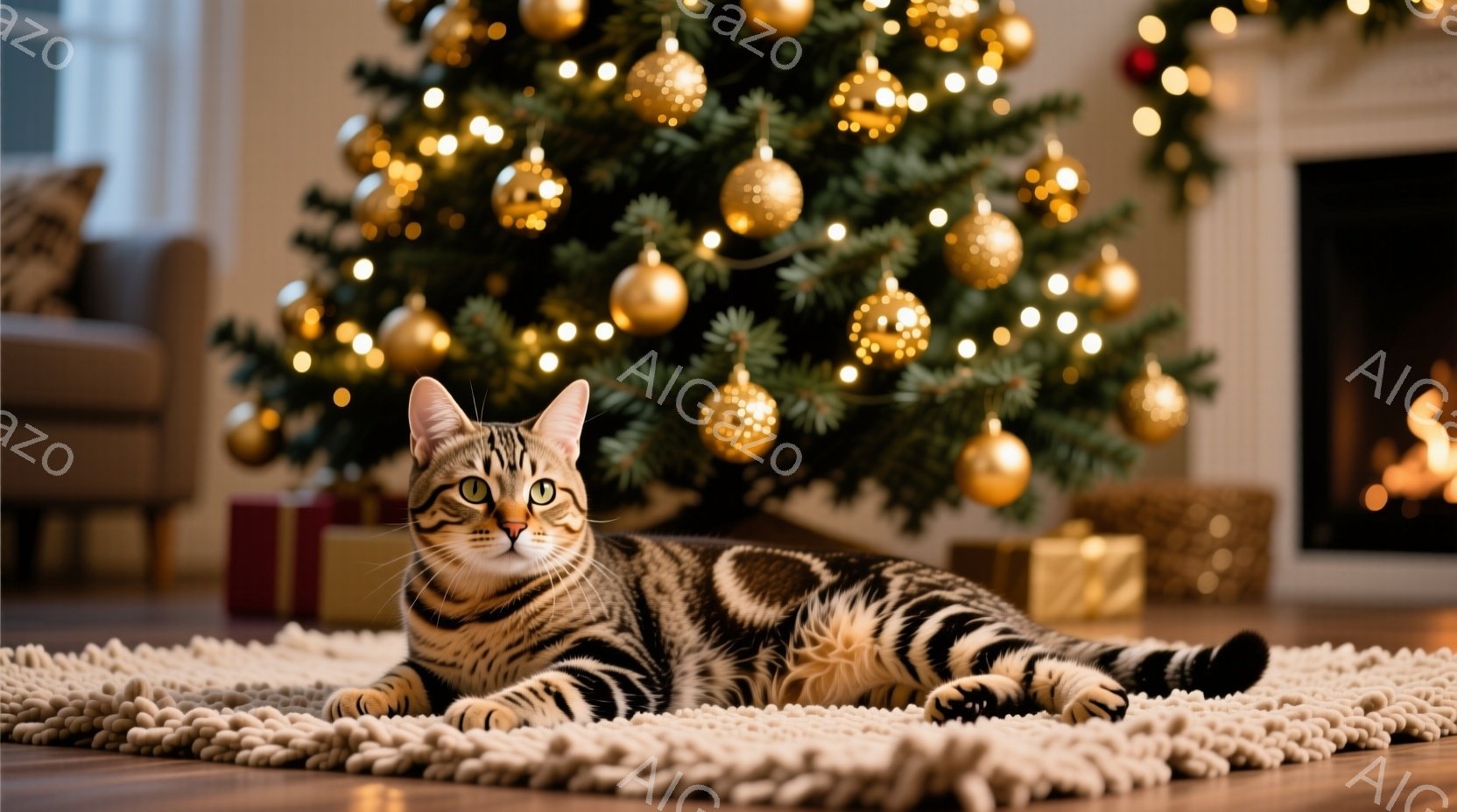 茶色の縞模様の猫が、ベージュ色の丸いラグの上に仰向けになってリラックスしています。背景には、金色のオーナメントで飾られたクリスマスツリーと、プレゼントボックスが見え、暖炉の光がほのかに照らしています。全体的に、温かく、穏やかで、クリスマスの雰囲気が漂う画像です。