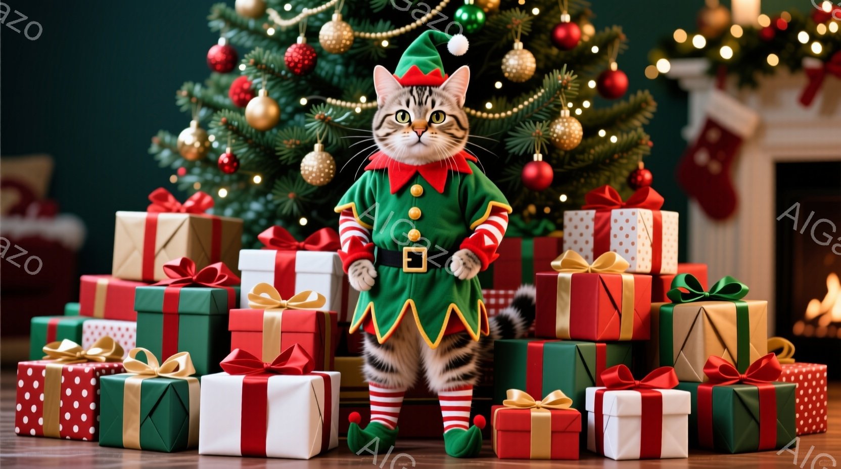 茶色の縞模様の猫が、緑色のエルフの衣装を着てプレゼントの山の中に立っています。エルフの衣装は帽子、ストライプの袖と脚、そして緑色の靴で構成されています。背景にはクリスマスツリー、暖炉、そしてカラフルなプレゼントが積み上げられ、温かくお祝いムードに満ちた雰囲気です。
