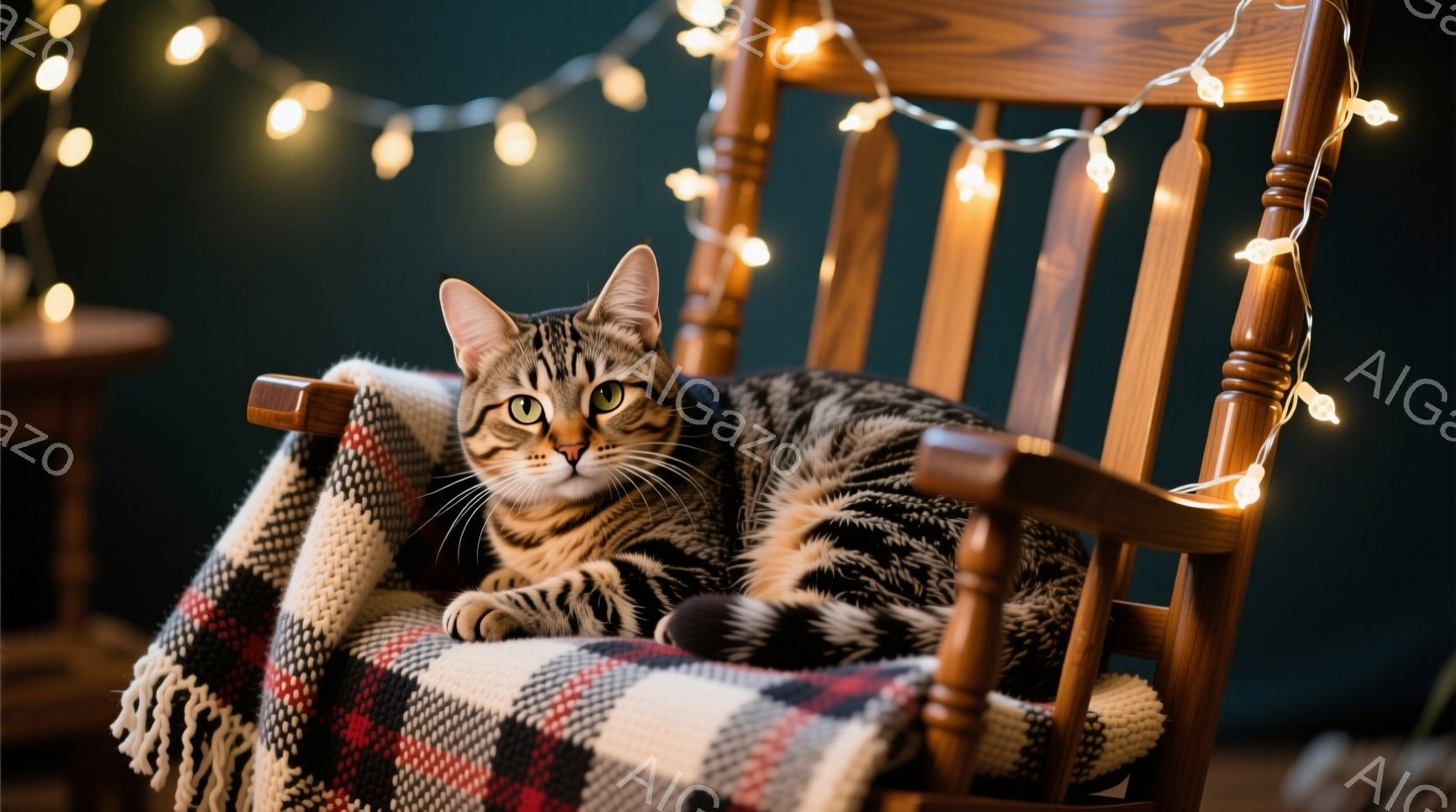 縞模様の猫が、チェック柄の毛布が敷かれたロッキングチェアにゆったりと横たわっています。猫はリラックスした表情で、正面を見ています。背景には、少しぼやけた植物と、温かみのある光が灯った装飾が写っており、居心地の良い雰囲気を醸し出しています。