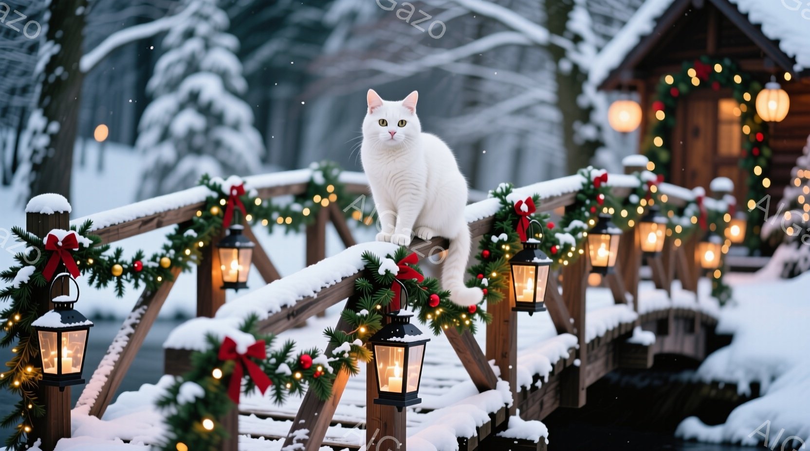 白い猫が雪で覆われた柵の上に座っており、鮮やかなエメラルドグリーンの目で見つめている。背景には、クリスマス飾りが施された小さな橋があり、暖かく光る提灯と雪に覆われた木々が冬の風景を彩っている。全体的に、穏やかで静謐な、クリスマスの雰囲気が漂う光景である。