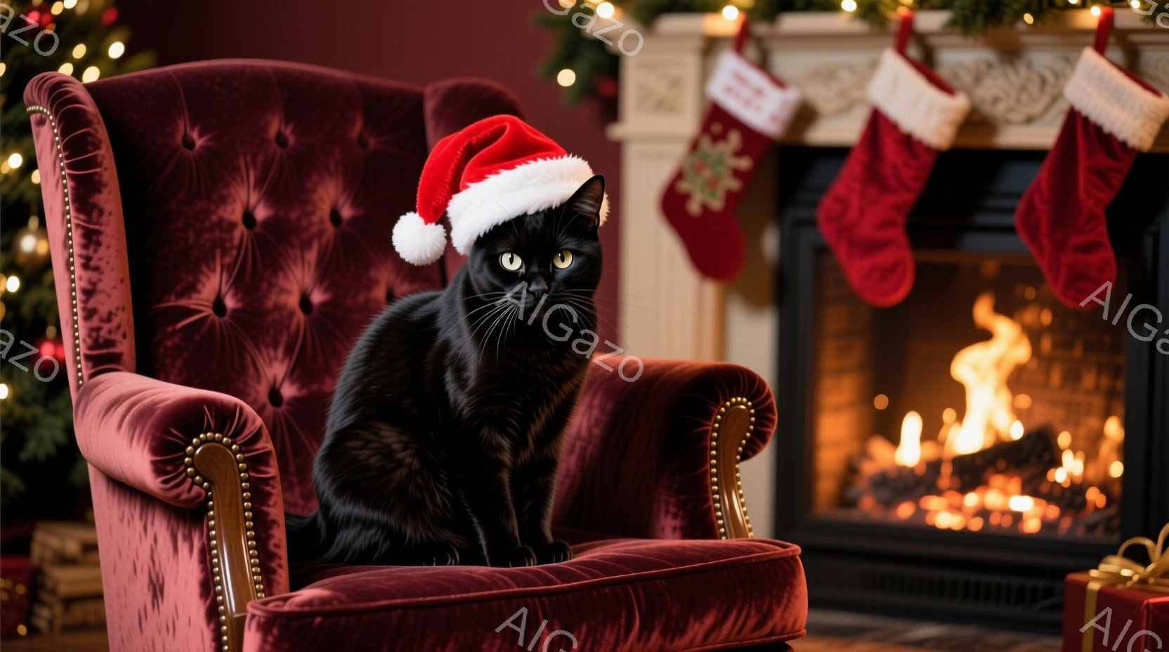 黒猫が赤いクリスマス風の帽子を被り、深紅色の肘掛け椅子に座っています。背景には暖炉があり、炎が燃え盛っているのが見え、クリスマスの飾り付けや赤いクリスマスストッキングが暖炉の周りに飾られています。全体的に暖かく、居心地の良い、クリスマスの雰囲気が漂っています。