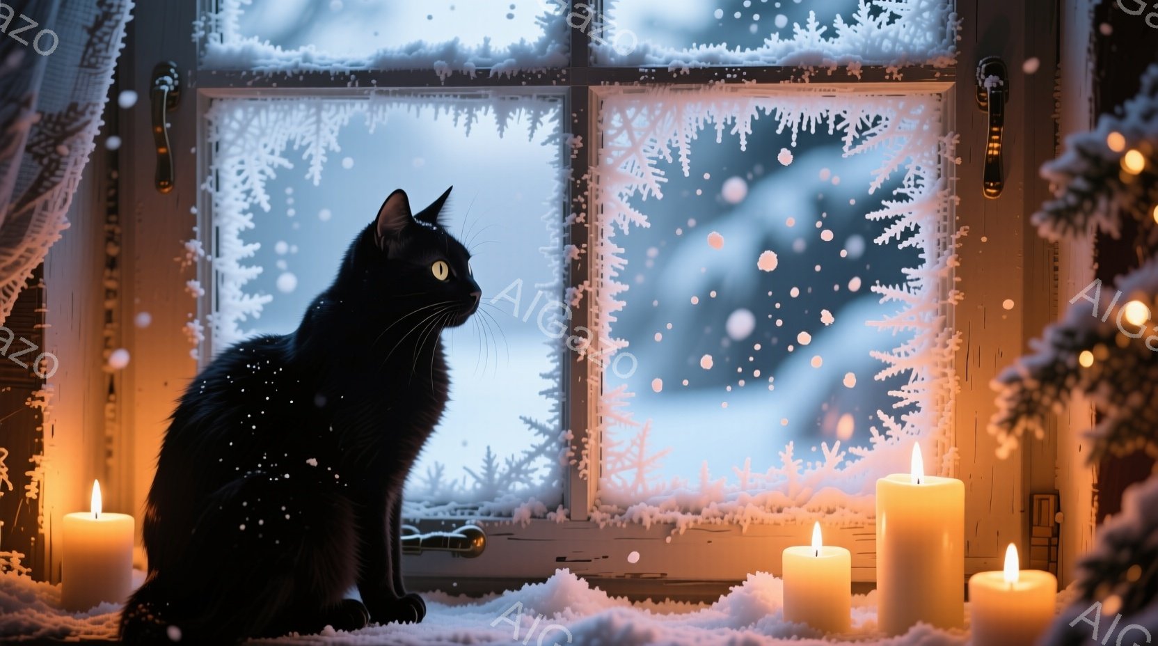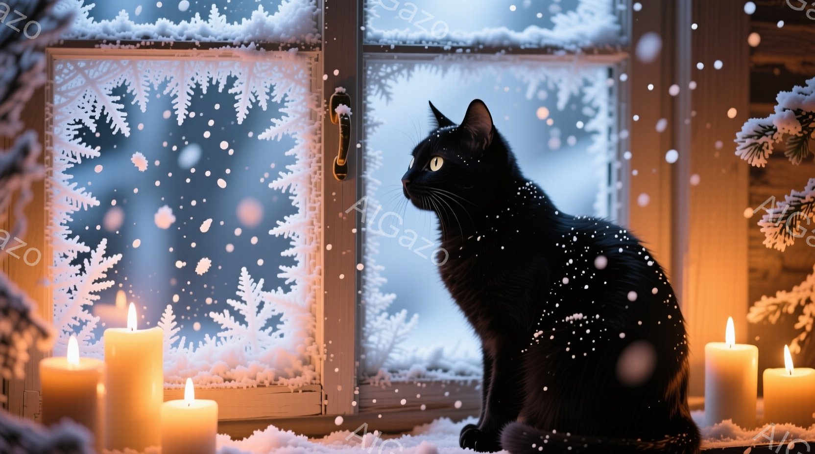 黒猫が雪の降る窓辺に座り、外を見つめている。窓には雪の結晶のような模様が描かれており、室内には数本のロウソクが灯り、暖かく穏やかな雰囲気を醸し出している。外は雪景色で、冬の静けさと安らぎを感じさせる。