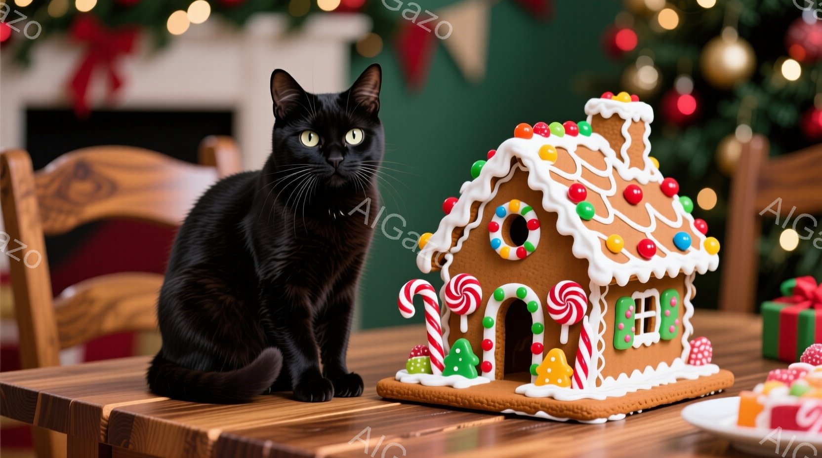 黒猫が木のテーブルの上に座り、クリスマスのジンジャーブレッドハウスの隣にいます。猫はまっすぐ前を見ており、目は明るく、リラックスした表情をしています。背景には、装飾されたクリスマスツリーやクリスマスの飾りがあり、温かくお祝いの雰囲気です。