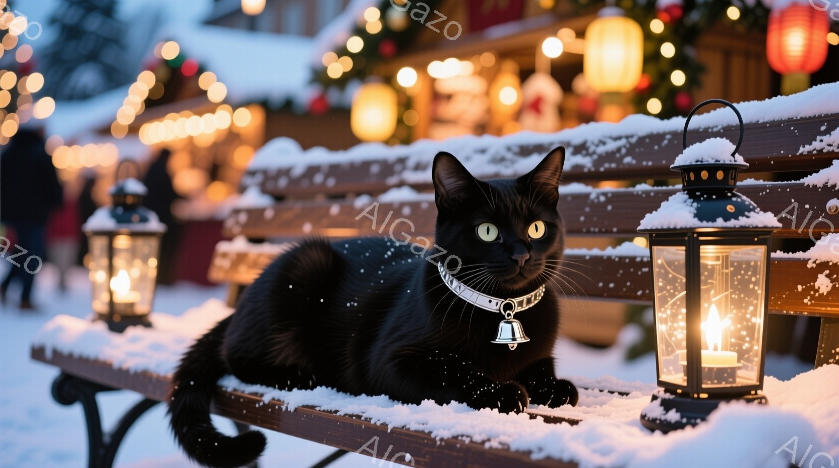 黒猫が雪の積もったベンチに横たわっており、首輪には小さな鈴が付いている。背景にはクリスマスツリーの明かりや、灯りのついたランタンが見え、雪が静かに降り積もる冬の夜の暖かく幻想的な雰囲気が漂っている。猫の目は鮮やかな緑色で、リラックスした様子が伺える。