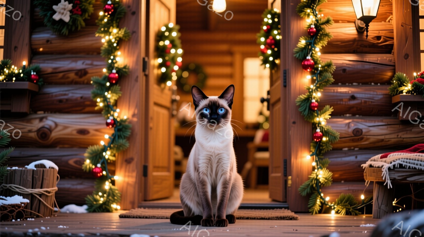 シベリアンブルーのポイントを持つ美しいシャム猫が、クリスマスツリーの飾り付けがされた家の入り口に座っています。猫は正面を見据え、澄んだ青い瞳が印象的で、堂々とした姿勢を保っています。背景には木製の壁とカラフルなクリスマスライトがあり、暖かくお祝いムードに満ちた雰囲気です。