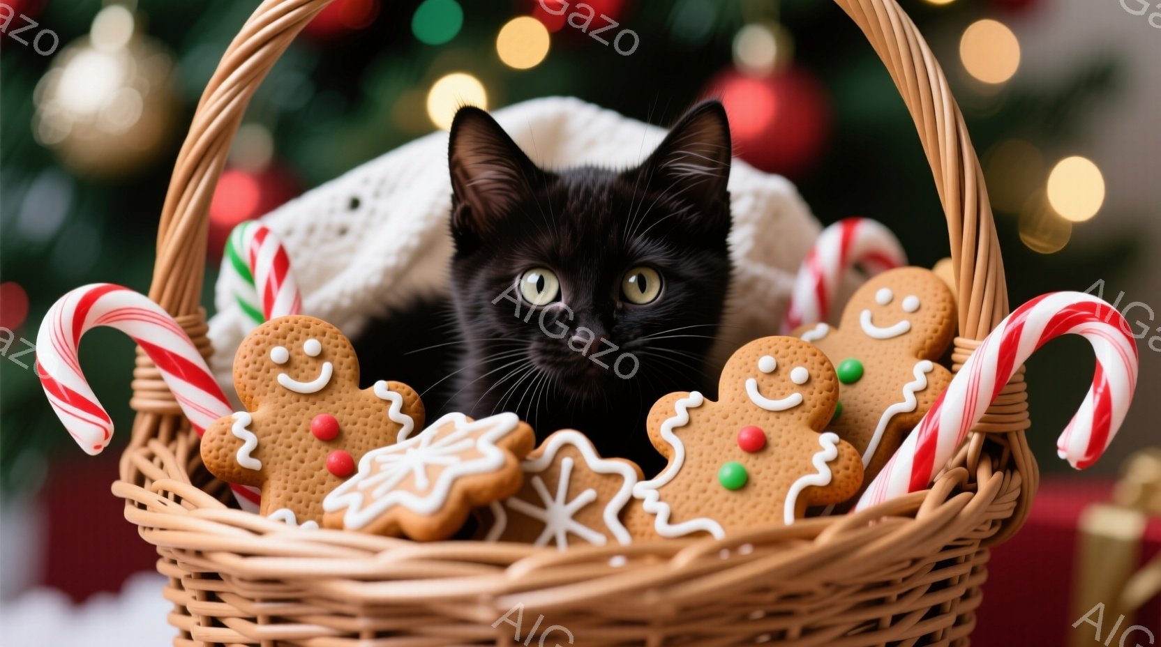 黒い猫が、クリスマスらしい籐の籠の中に座っており、周りにはジンジャーブレッドマンとキャンディケーンが散りばめられています。猫は正面を見つめ、少しいたずらっぽい表情を浮かべており、背景にはぼやけたクリスマスツリーの飾りが見えます。全体的に暖かく、遊び心のあるクリスマスの雰囲気が漂っています。