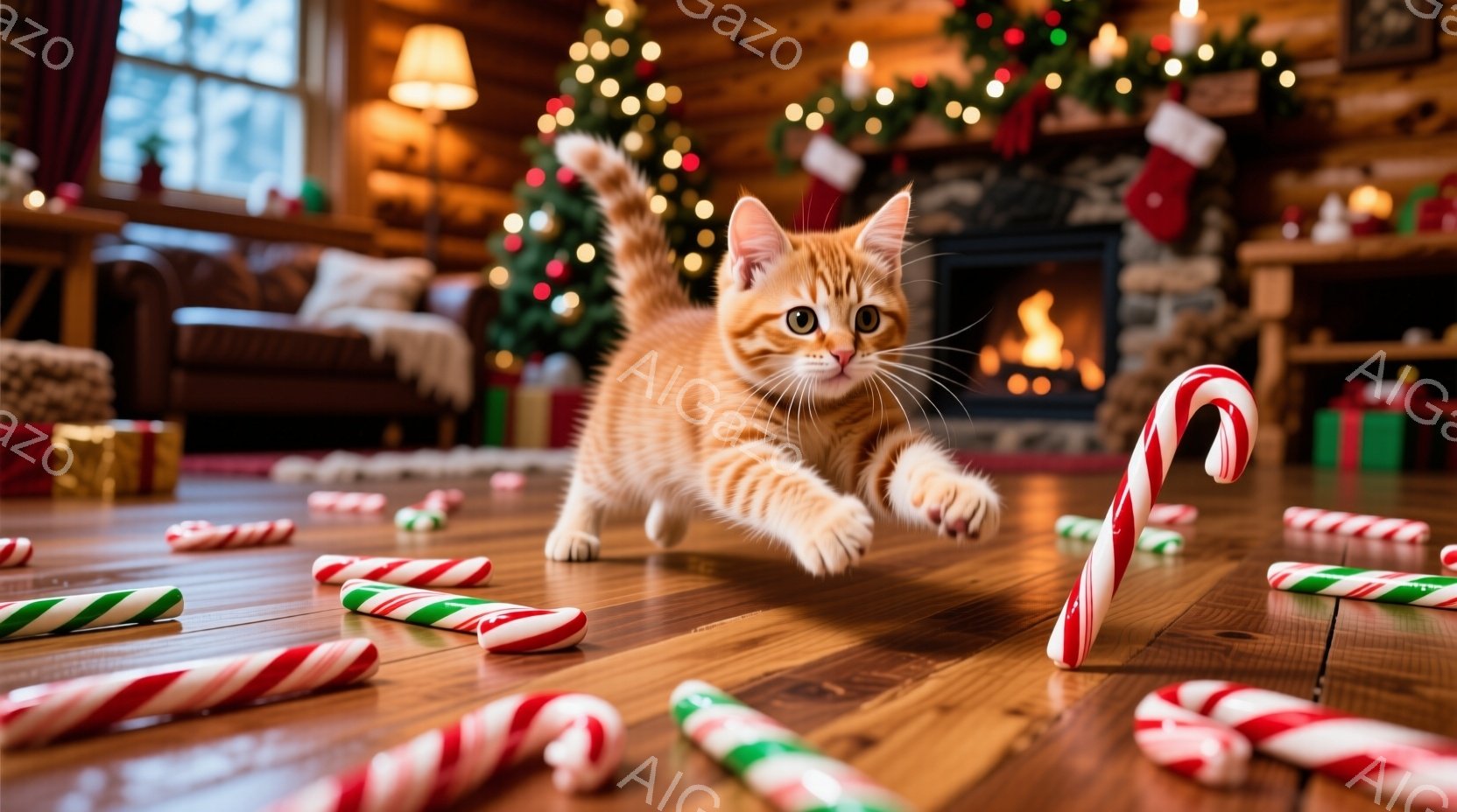 明るい木製の床に、オレンジ色の縞模様の小さな子猫が、クリスマスキャンディケーンを追いかけるように飛び跳ねています。背景には、クリスマスツリーや暖炉、プレゼントの箱が見え、暖かく、お祝いムードいっぱいのリビングルームの様子が伺えます。全体的に、活発で遊び心のある、幸せなクリスマスの雰囲気が漂っています。