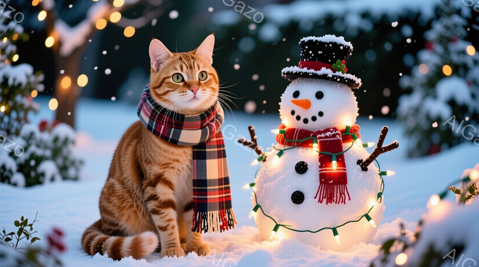 茶色の縞模様の猫が雪の上に座り、チェック柄のマフラーを巻いています。背景には雪だるまが飾られており、小さな電飾でライトアップされています。雪景色の中で、暖かく穏やかな冬の雰囲気が漂っています。