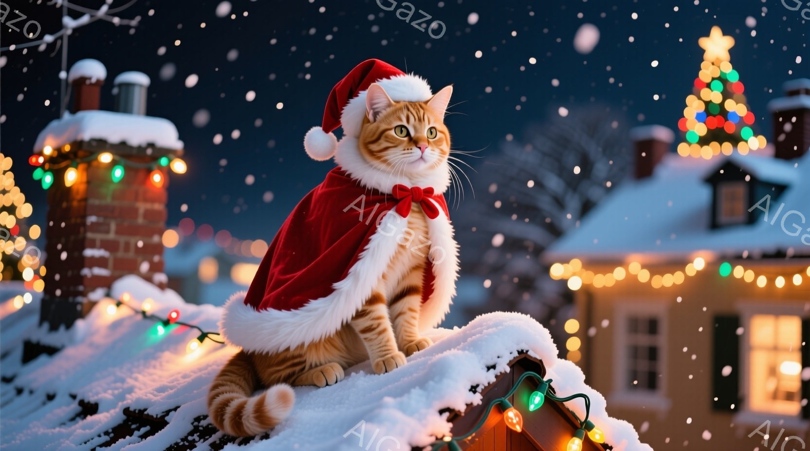 屋根の上には、サンタ帽と赤いマントを身につけたオレンジ色の猫が座っています。その表情は穏やかで、どこか余裕があるようです。背景には、クリスマスツリーの光と雪に覆われた家々が広がり、幻想的な冬の夜の雰囲気を醸し出しています。