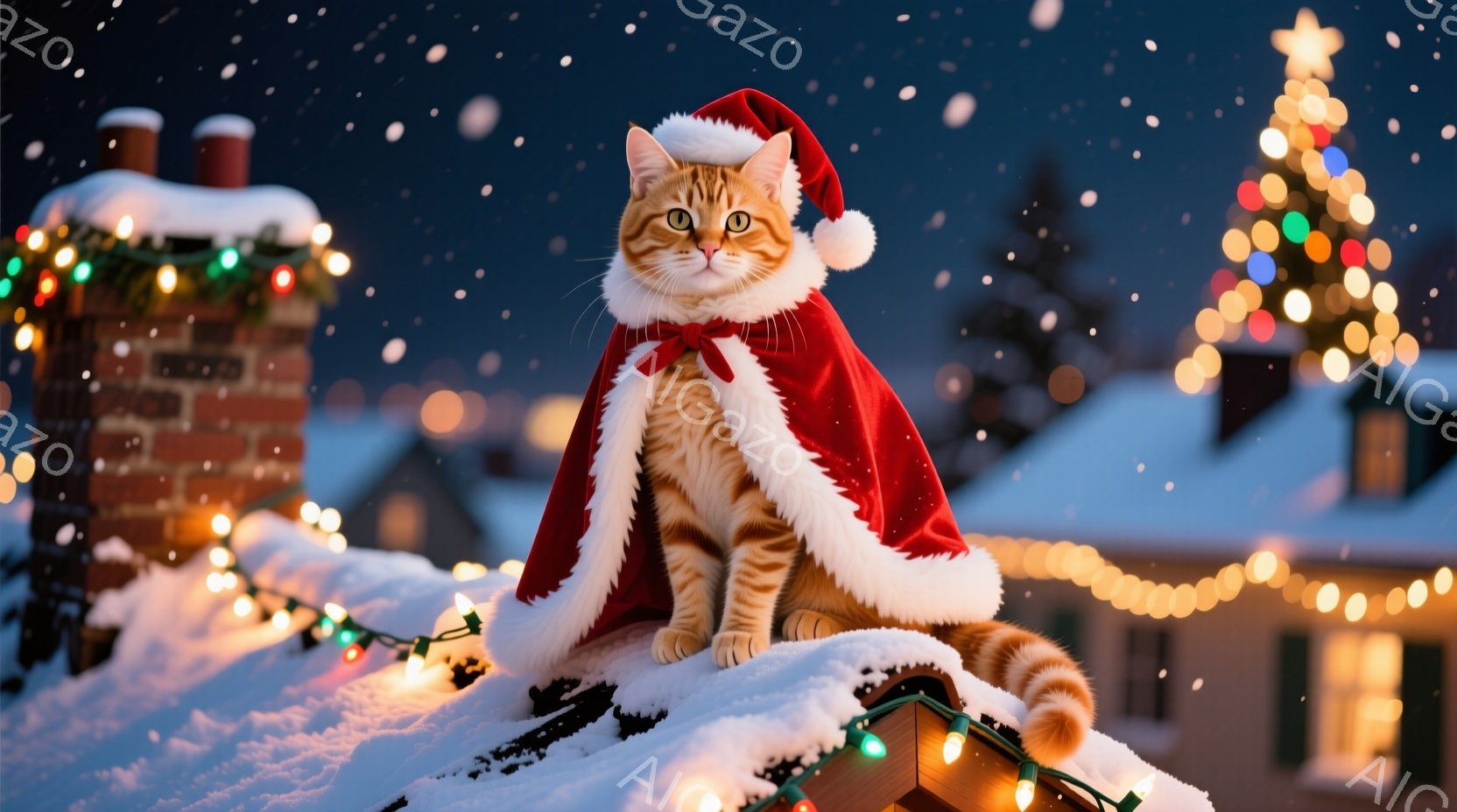 縞模様の猫がサンタクロースの衣装を着て、雪の積もった屋根の上で座っています。猫は赤いマントと帽子を身につけ、穏やかな表情でカメラを見ています。背景には、クリスマスツリーが飾られた家々が広がり、雪が降る冬の夜の温かく幻想的な雰囲気を醸し出しています。