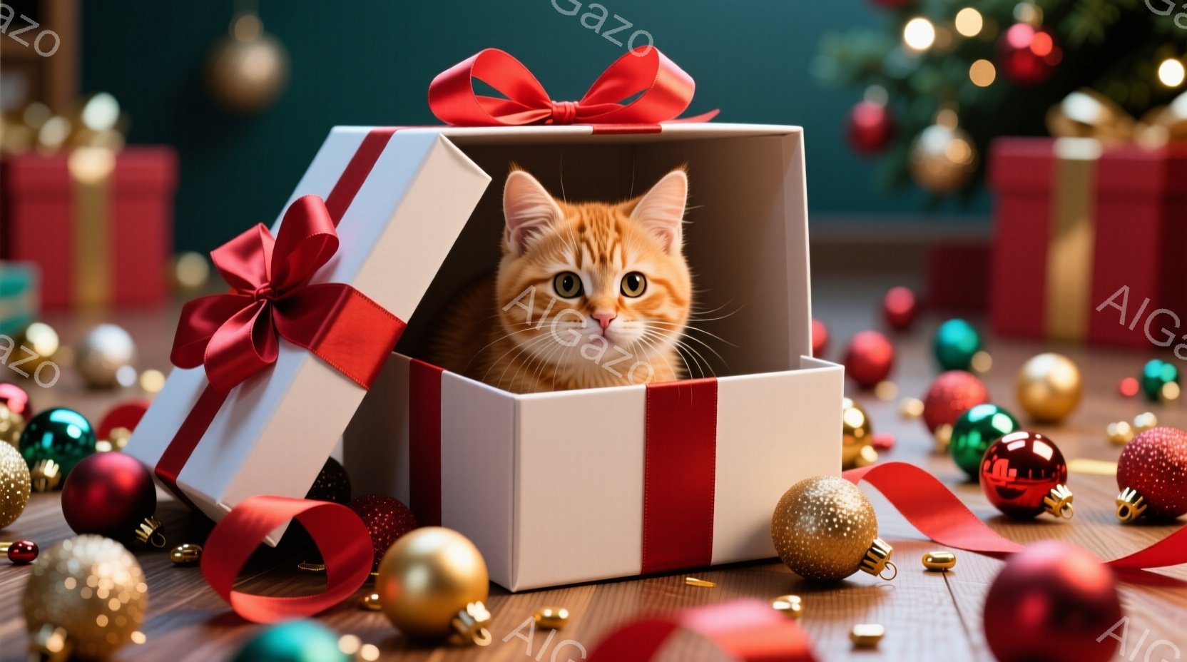 この無料AI生成画像「白いギフトボックスにオレンジ色のキティが顔を出しています。キティは好奇心旺盛な表情で、少しだけ箱の中から外を見ています。背景には、様々な色のクリスマスオーナメントが散らばり、お祝いの雰囲気を醸し出しています。」は、2025年10月25日に作成されました。 サイズは 1664×928px の高解像度で、商用利用も可能なフリー素材として提供しています。