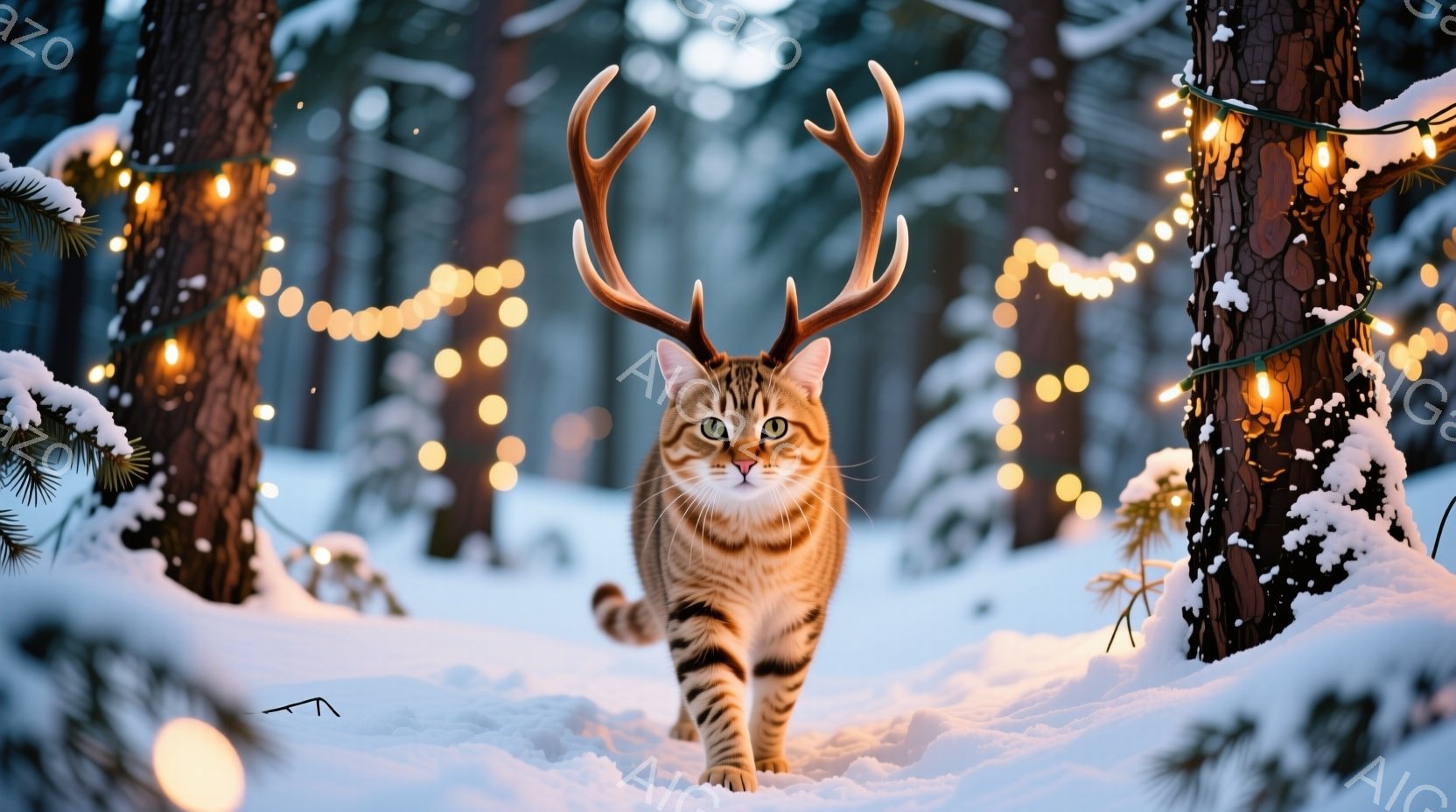 鮮やかなオレンジ色の猫が、丸太造りの家のポーチに座って正面を見つめています。家の周りにはクリスマスイルミネーションが飾り付けられ、クリスマスのリースが飾られています。暖かく穏やかな雰囲気で、冬のクリスマスの装飾が印象的です。