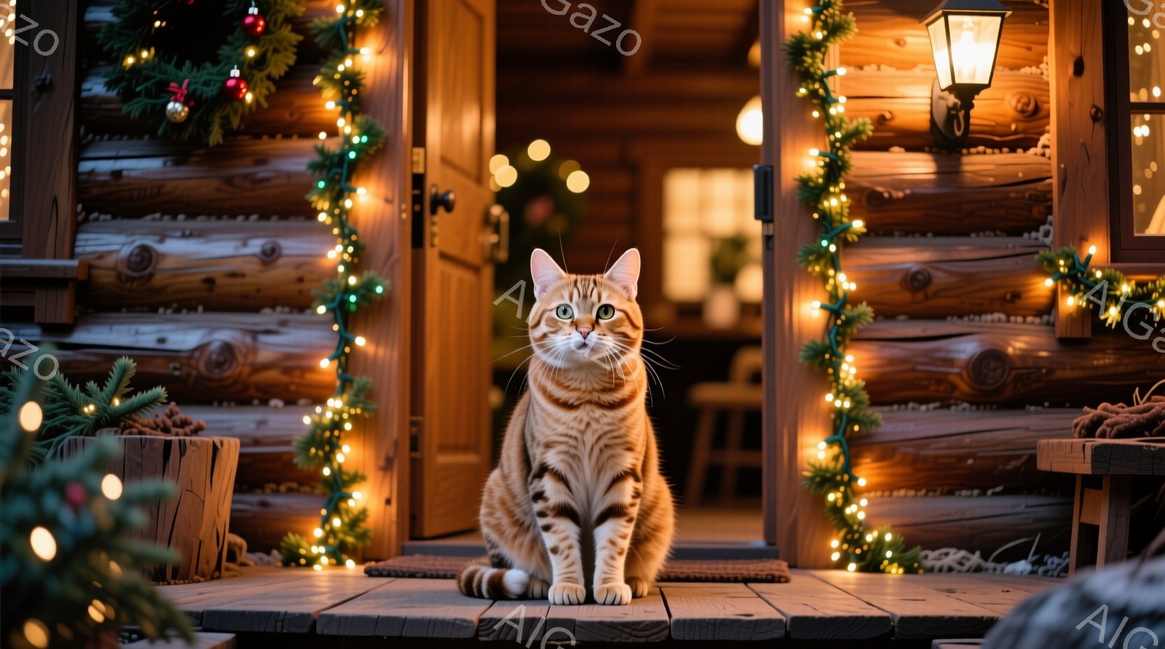 暖炉の光と装飾で飾られた木造の家の階段に、鮮やかなオレンジ色の毛並みの猫が座っています。猫は正面を見ており、好奇心と静けさが混ざった表情をしています。背景には、クリスマスの装飾が施された玄関や、緑豊かな植物が見え、温かく、お祝いムードに包まれた雰囲気です。