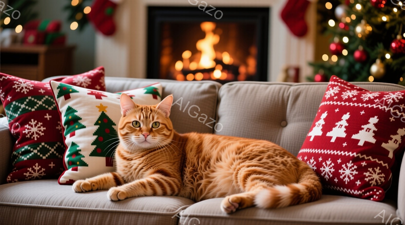 オレンジ色のトラ猫が、クリスマス柄のクッションに挟まれて、ゆったりとソファーに横たわっています。暖炉の炎とクリスマスツリーの光が、猫の毛並みを照らし、温かさと安らぎの雰囲気を醸し出しています。背景にはぼんやりと家具が見え、冬の室内でくつろぐ猫の穏やかな時間が表現されています。