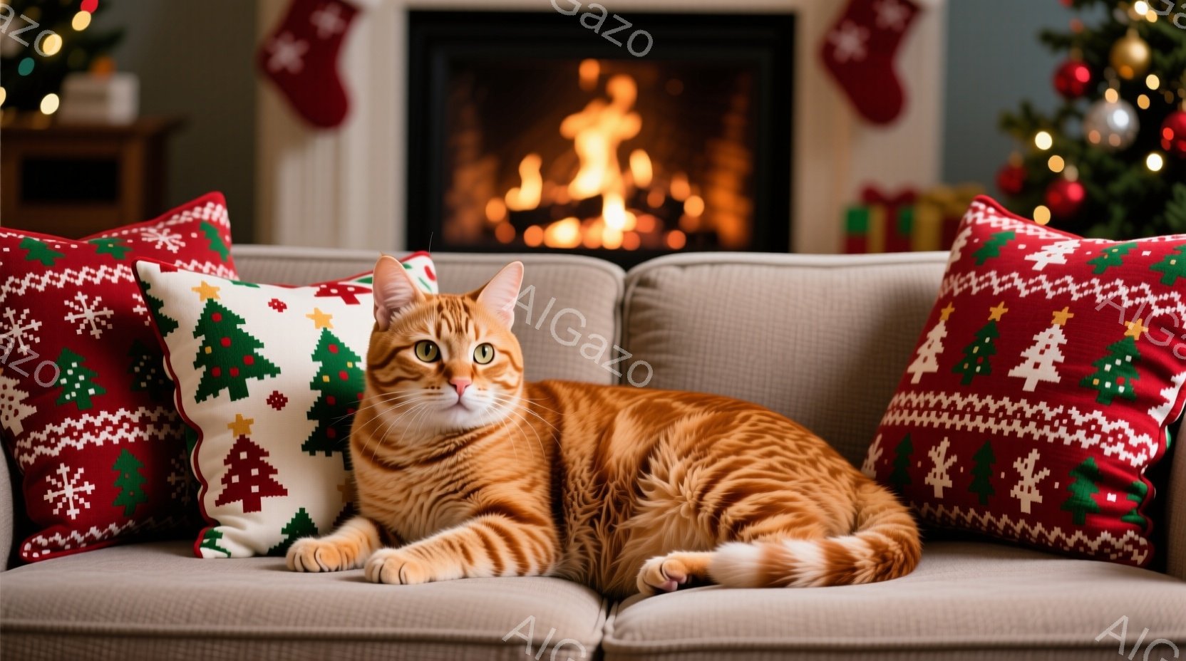 暖炉のあるリビングルームで、オレンジ色の縞模様の猫がソファーに横たわっています。猫はリラックスした表情で、前足を伸ばしてくつろいでおり、背景にはクリスマスツリーと飾り付けが見えます。暖炉の光とクリスマスの装飾が、温かく心地よい雰囲気を醸し出しています。