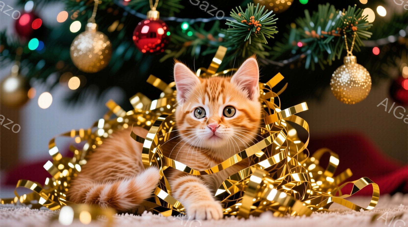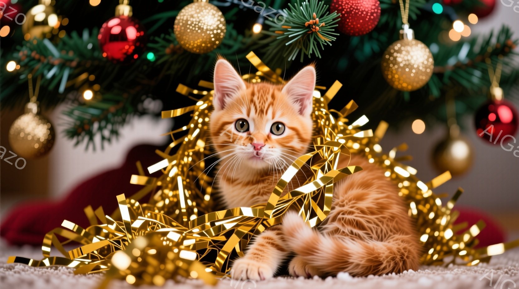 オレンジ色の毛並みの可愛い子猫が、キラキラと輝く金色の飾り付けの中に横たわっています。子猫は丸い瞳でカメラを見つめ、リラックスした表情を浮かべています。背景にはクリスマスツリーの緑とオーナメントの赤が映り、お祝いの雰囲気を感じさせます。