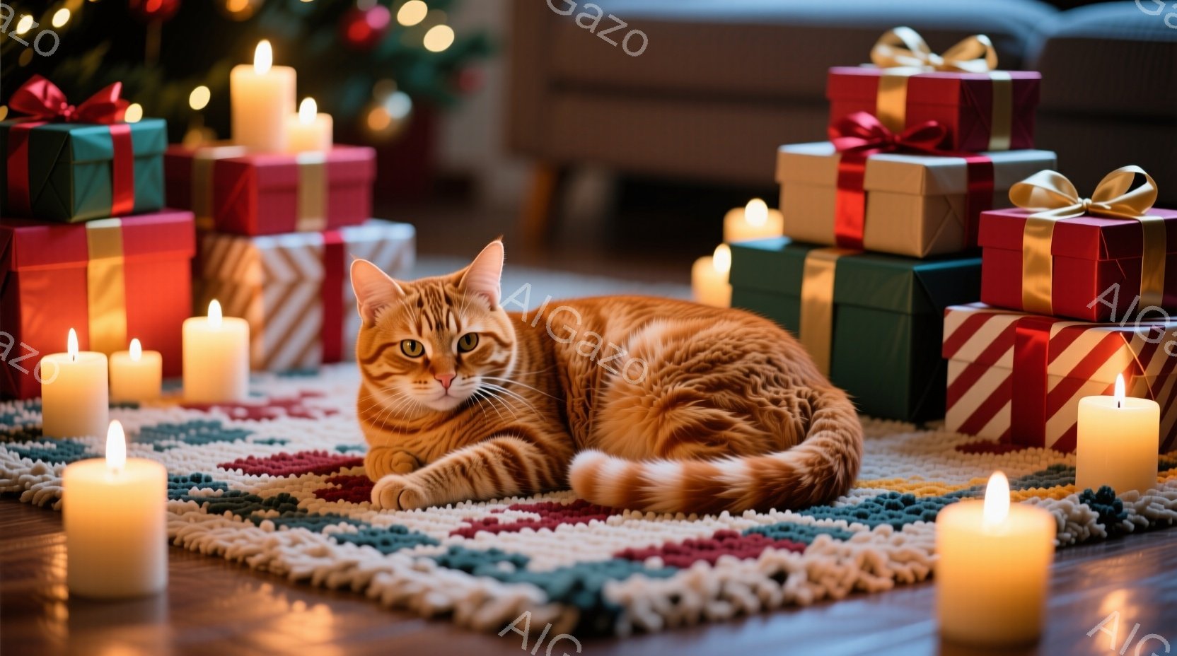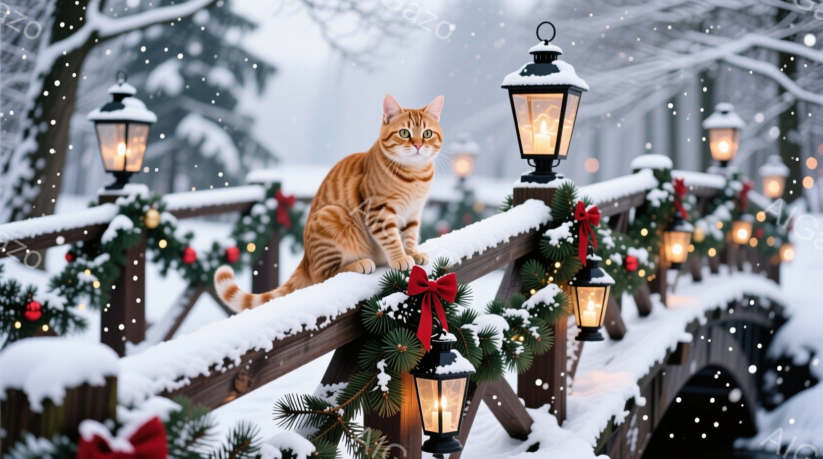 雪が降る中、茶色の縞模様の猫が雪で覆われた橋の欄干に座って正面を見つめている。橋はクリスマスツリーの飾りや赤いリボンで飾られ、周囲には点灯したランタンが並んでいる。背景には雪に覆われた木々がぼんやりと見え、暖かく穏やかな冬の雰囲気を醸し出している。