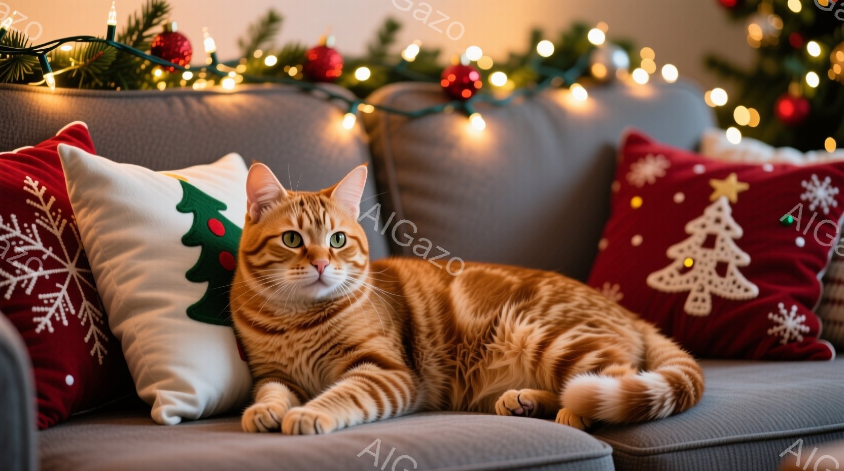 オレンジ色の縞模様の猫が、クリスマスの柄のクッションに囲まれた灰色のソファにゆったりと横たわっています。猫はリラックスした表情でカメラを見つめており、背景にはキラキラと光るクリスマスライトが見えます。全体的に暖かく、穏やかな冬の雰囲気が漂っています。