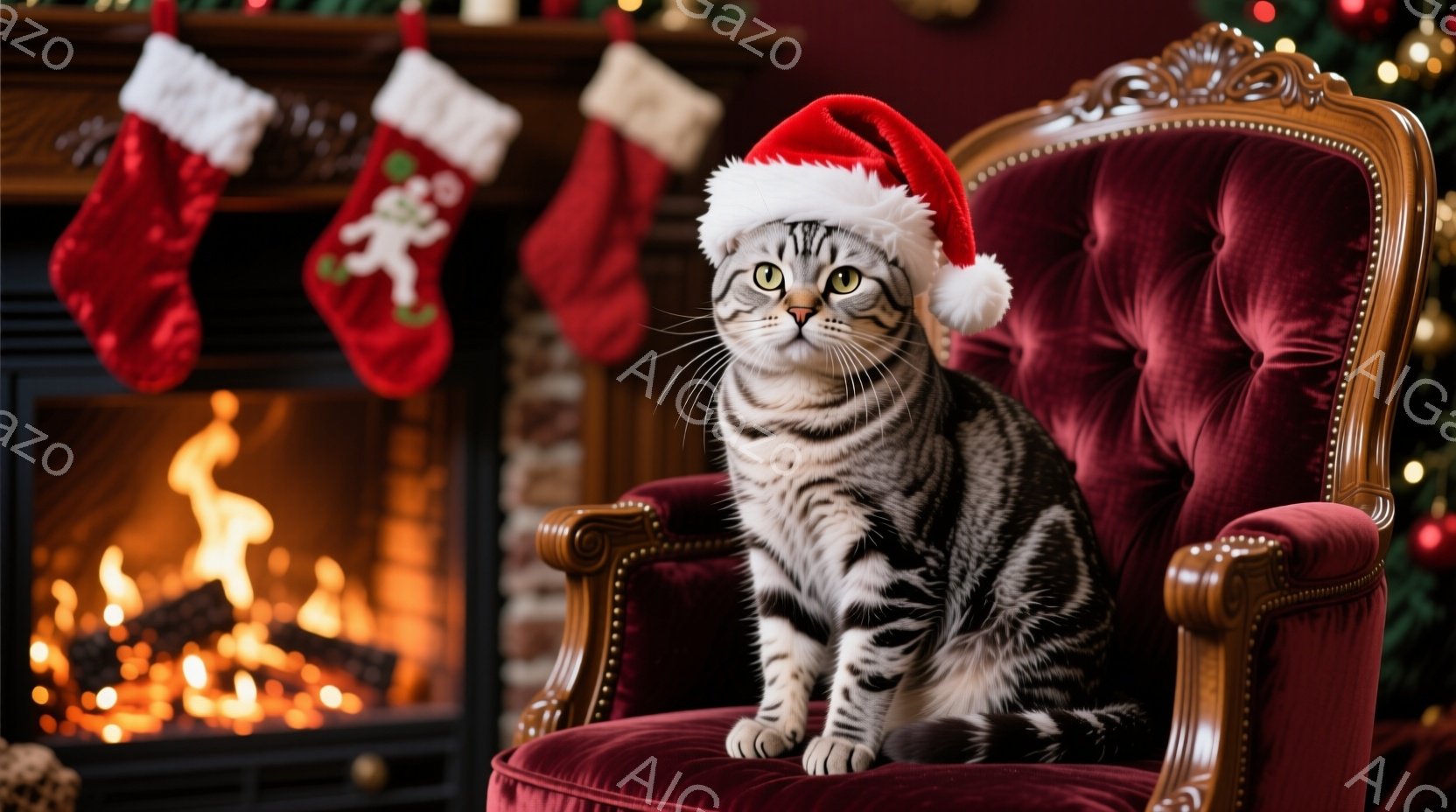 縞模様の猫が赤いサンタの帽子を被り、ベルベットの赤い椅子に座っている。背景にはクリスマスツリーの飾りと暖炉の炎が見え、暖かく、お祝いの雰囲気を醸し出している。猫は前を見据え、少し退屈そうな表情をしている。