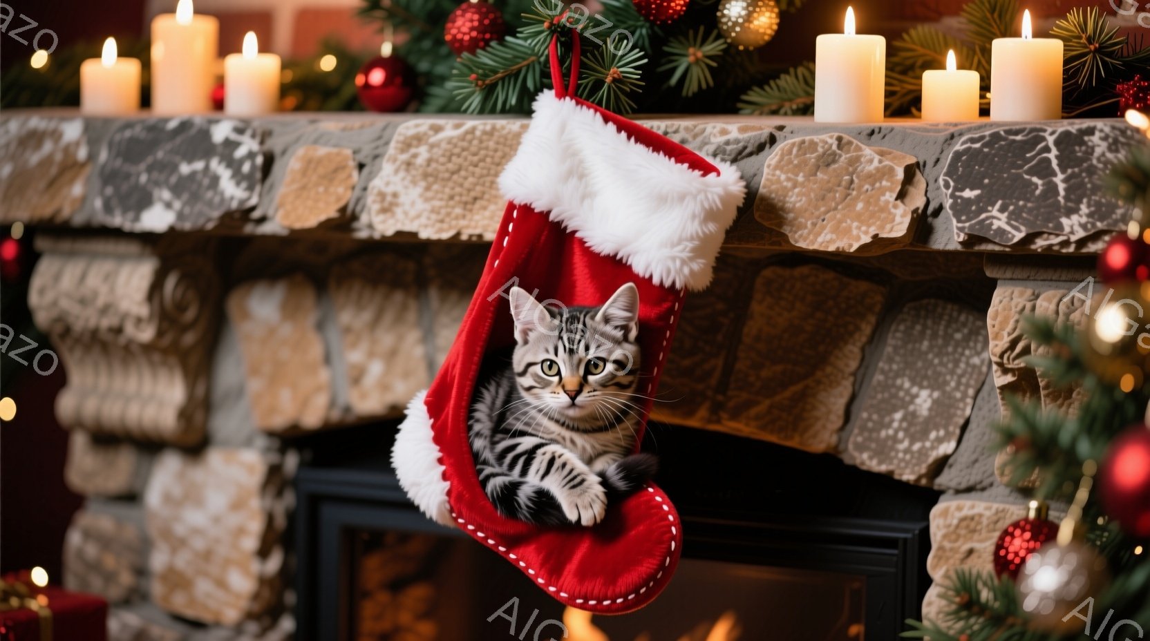 赤いクリスマスストッキングの中に、縞模様の可愛い子猫が丸まって座っています。背景にはレンガ造りの暖炉と、飾り付けられたクリスマスツリー、そして灯されたキャンドルが見え、温かさと穏やかな祝祭の雰囲気が漂っています。子猫は好奇心と少しの戸惑いを見せる表情で、こちらを見つめています。