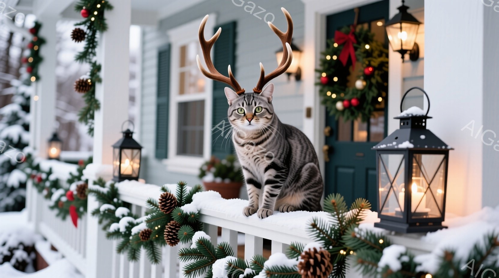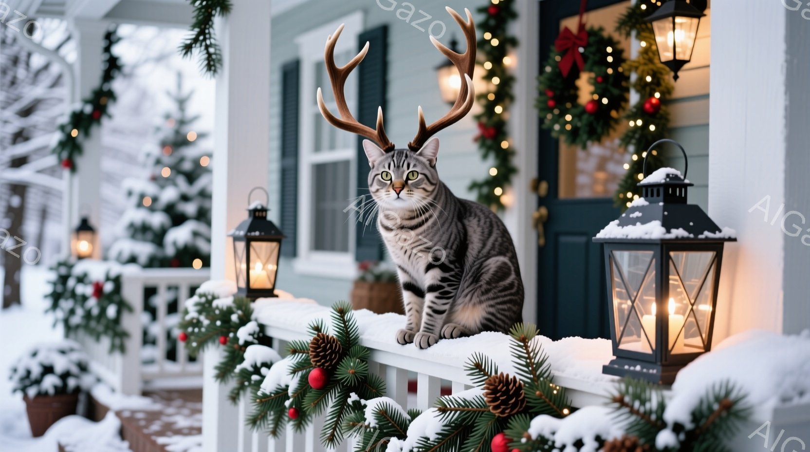 白い手すりに座った灰色の縞模様の猫が、クリスマス風の角の飾りを頭につけて正面を見つめている。背景には、クリスマスツリーの飾り付けが施された玄関と、雪で覆われた庭、そして薄暗い冬の空が広がり、暖かい光が灯ったランタンが猫の周りを照らしている。全体的に、温かくお祝いムードにあふれる、クリスマスの風景である。