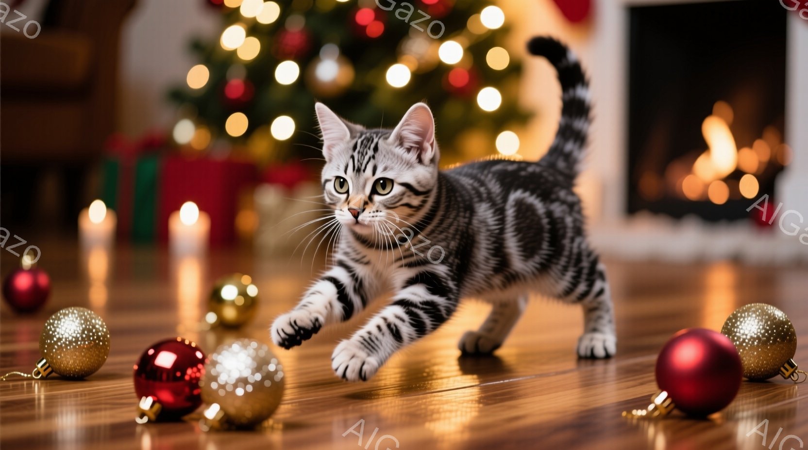 縞模様の小さな子猫が、クリスマスツリーの周りに散らばったオーナメントに向かって飛びかかろうとしています。木製の床には、金と銀の光り輝くボールが転がり、背景にはぼやけたクリスマスツリーと暖炉が見えます。全体的に、温かく、遊び心に満ちた、お祝いの雰囲気です。