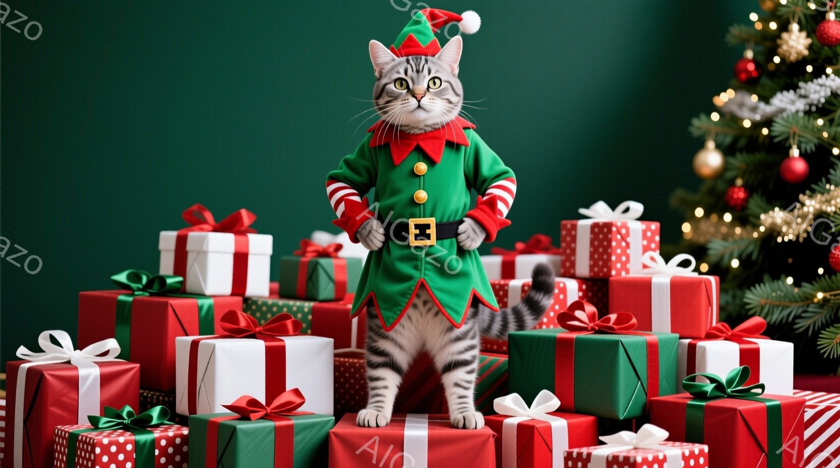縞模様の猫が緑と赤のストライプのズボンと緑のジャケット、そして先のとがった帽子を身に着けています。猫はプレゼントの山の上に立ち、前足を組み、少し自慢げな表情をしています。背景にはクリスマスツリーが飾られ、たくさんのプレゼント箱が積み重ねられており、全体的に祝祭的で楽しい雰囲気が漂っています。