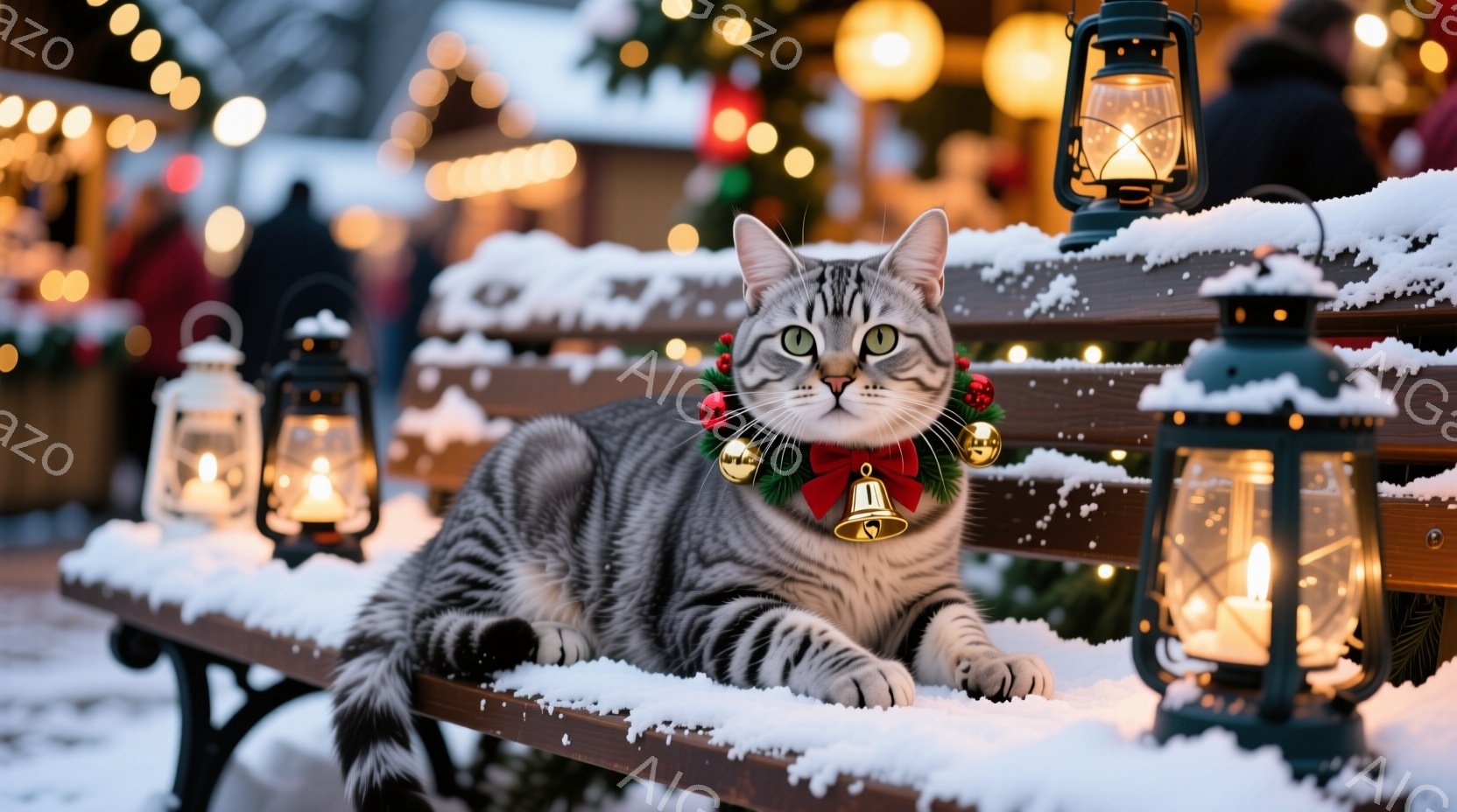 縞模様の猫が、雪で覆われたベンチにゆったりと横たわっています。赤い首輪にはクリスマスベルの飾りがあり、その表情はどこか余裕と自信に満ちています。背景にはクリスマスの飾り付けがされた建物や木々がぼやけて見え、雪が舞う幻想的な冬の雰囲気を醸し出しています。
